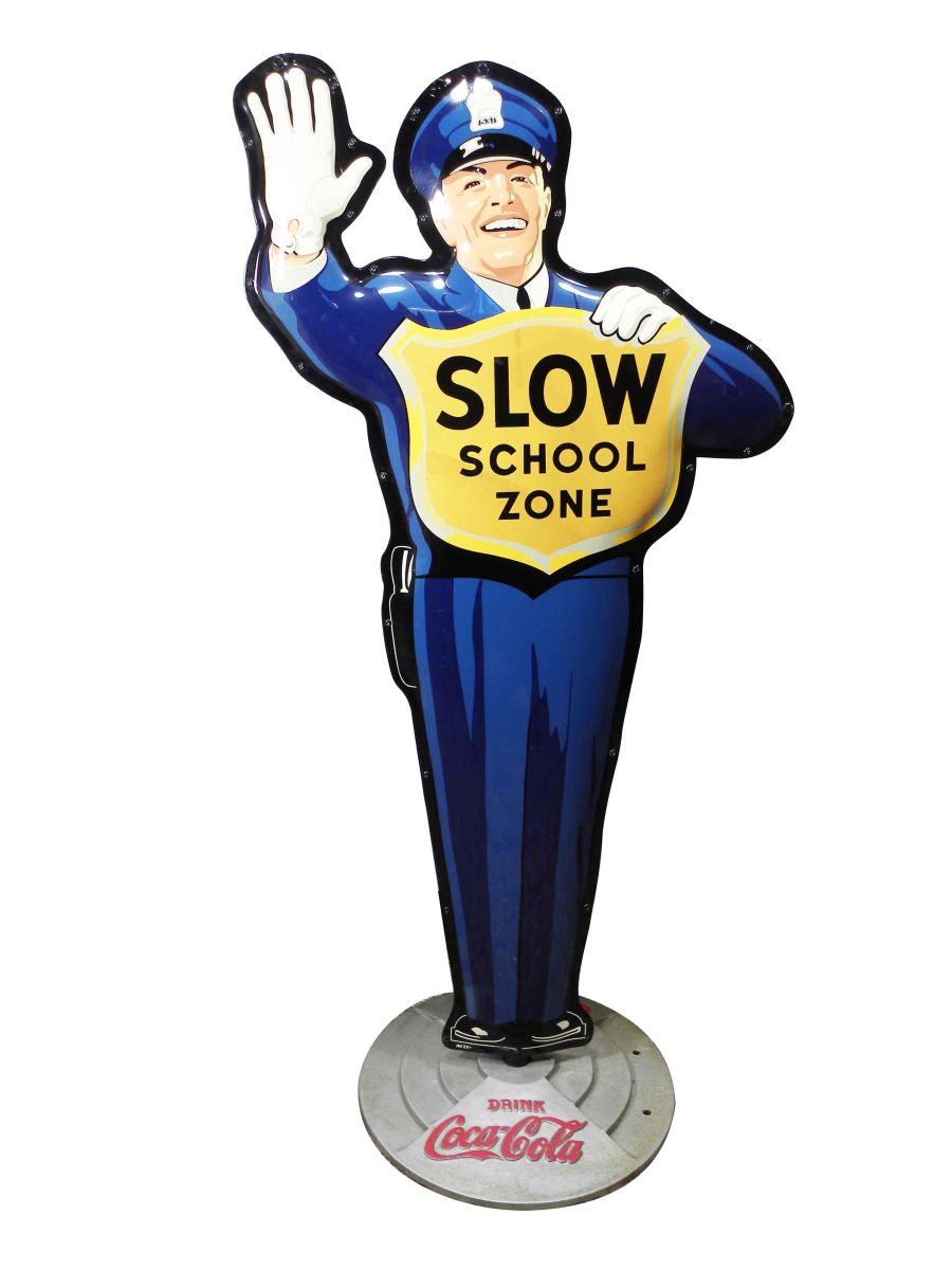 Coca Cola School Traffic Police. Policeman front near mint, back slight scratch across emblem and minor blemish below hand otherwise excellent condition, base has some minor rust. This is the nicest one we have seen in a long time. 30 X 62 1/2 inches.