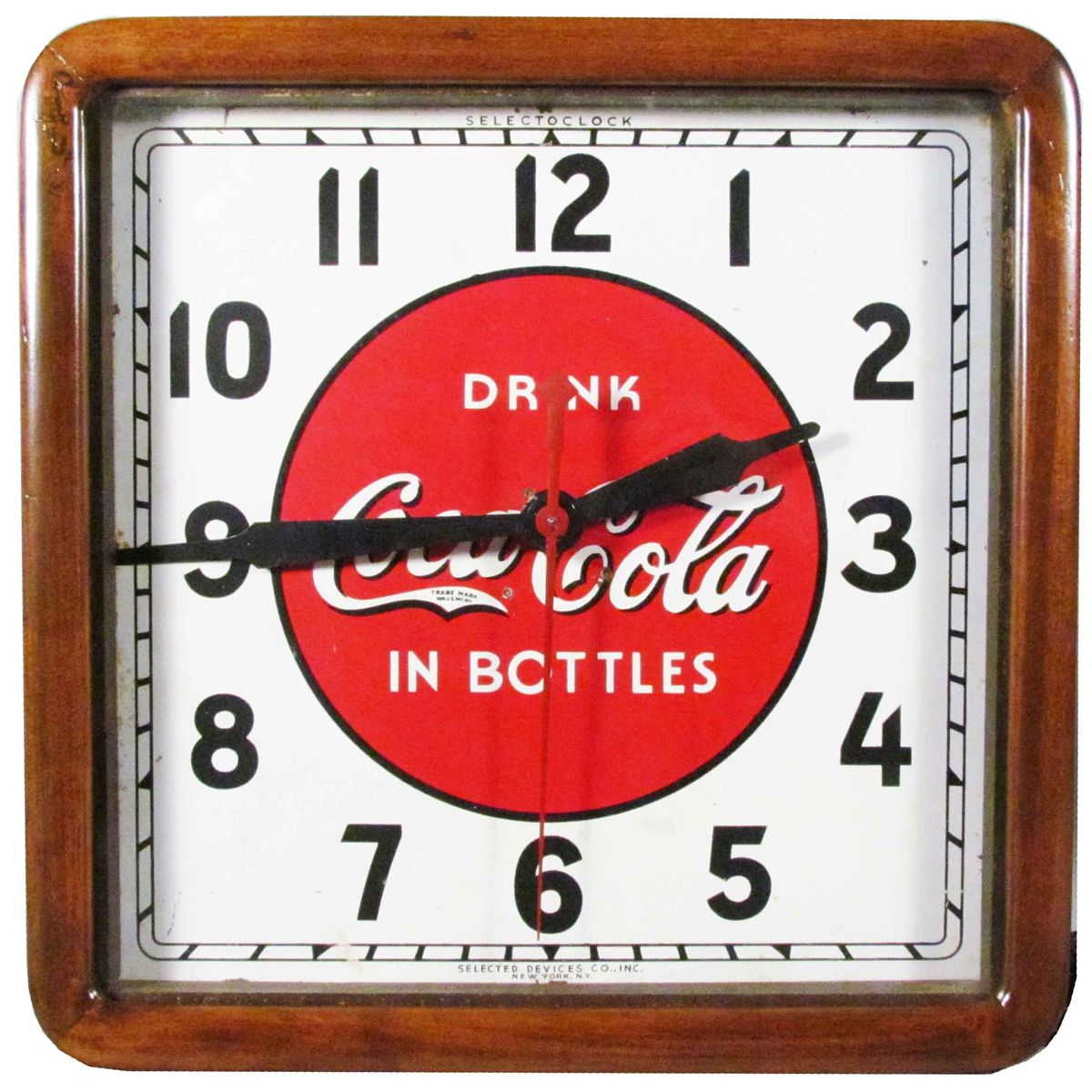 Coca Cola Selecto Clock. Select Devices Co. Inc. New York. Tin face with walnut case. Very good, non-working condition. 16 inches square X 3 1/2 inches deep.