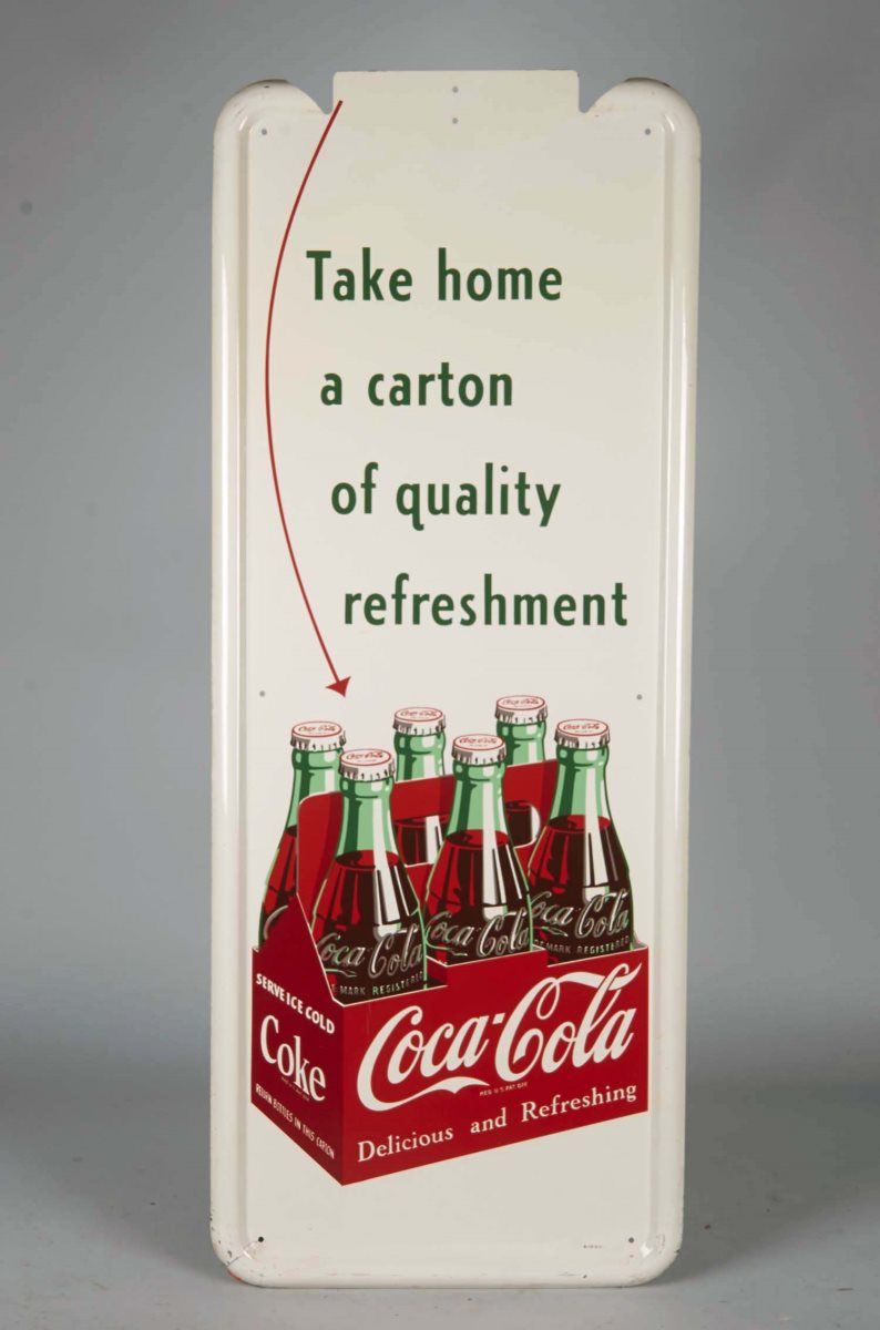 White background features 6-pack of bottles and reads "Take home a carton of quality refreshment." Circa 1951 (bottom right labelled A-M 9-51), has space at top for attaching button sign, shows minor wear to edges. Condition (Very good). Size 41" x 16"