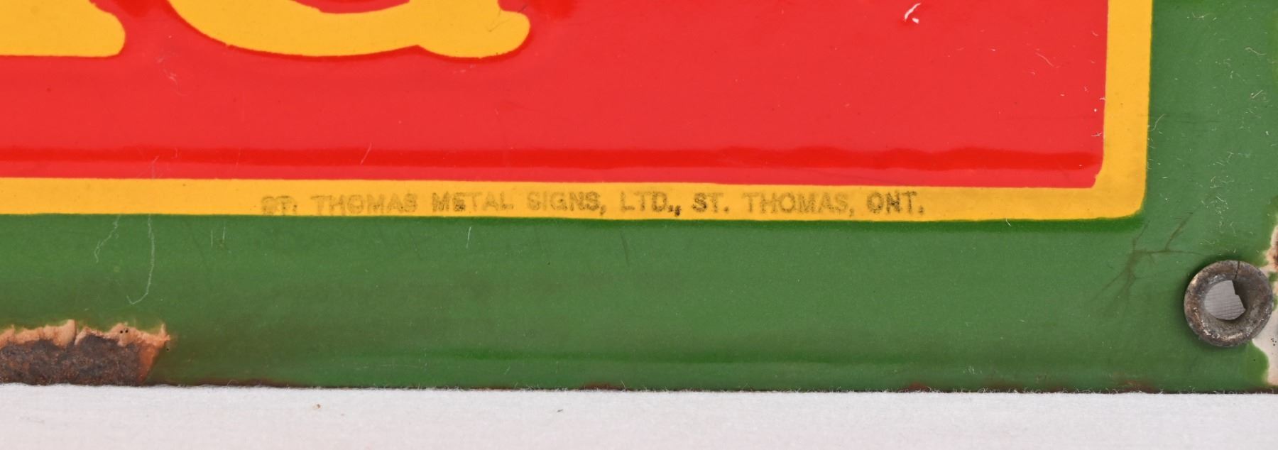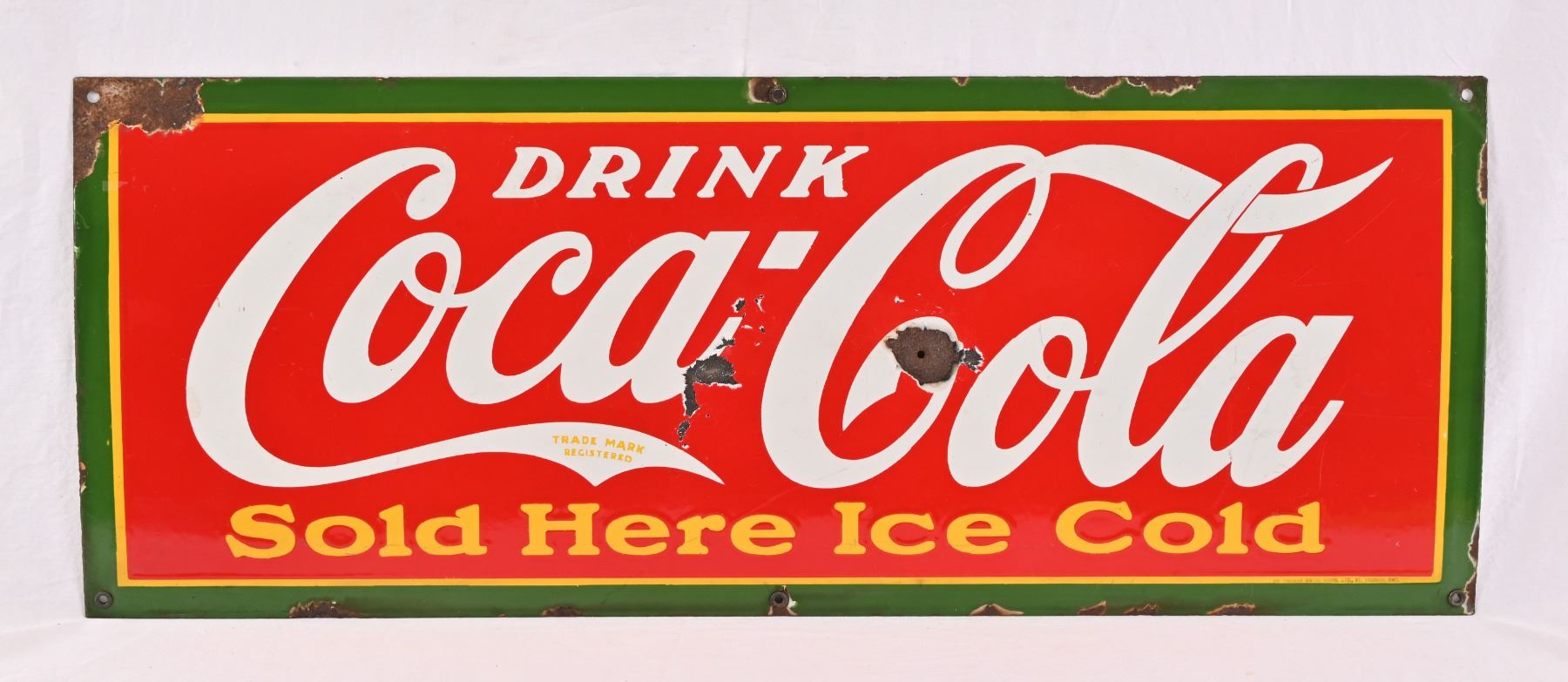 "Sold Here, Ice Cold", manufactured by St. Thomas Metal Signs, Ontario Canada. 12" x 31"