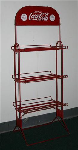Metal stand measures approximately 18" x 46" H originally used to display 6 bottle cartons of Coca Cola. Logo is the same on front and back. A few paint chips overall, but otherwise in good condition. A neat item for the Coke Collector.