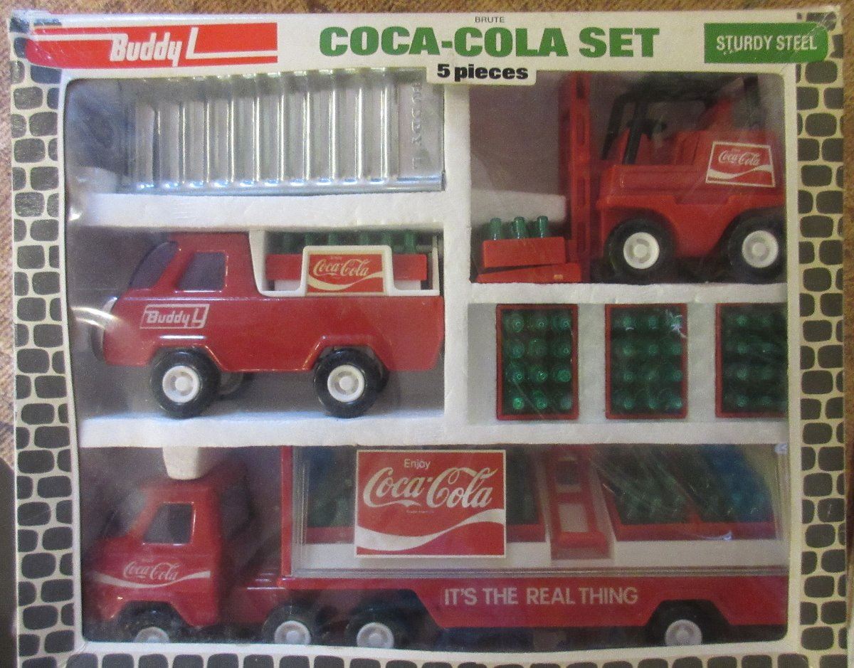 Coca Cola Coke 5 piece set Buddy L #4973 Semi , Van , Forklift , Plastic Coke Cases with plastic bottle of coke , Ramp