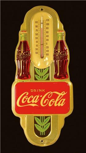 Coca Cola Embossed Die Cut 1941 Gold Version Thermometer. Small dent at bottom otherwise excellent condition. 7 X 16 inches.