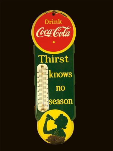 Coca Cola Thermometer, Canadian 1939, green version. Chips at 8:00, top and bottom otherwise very good condition. 5 3/4 X 18 1/4 inches.