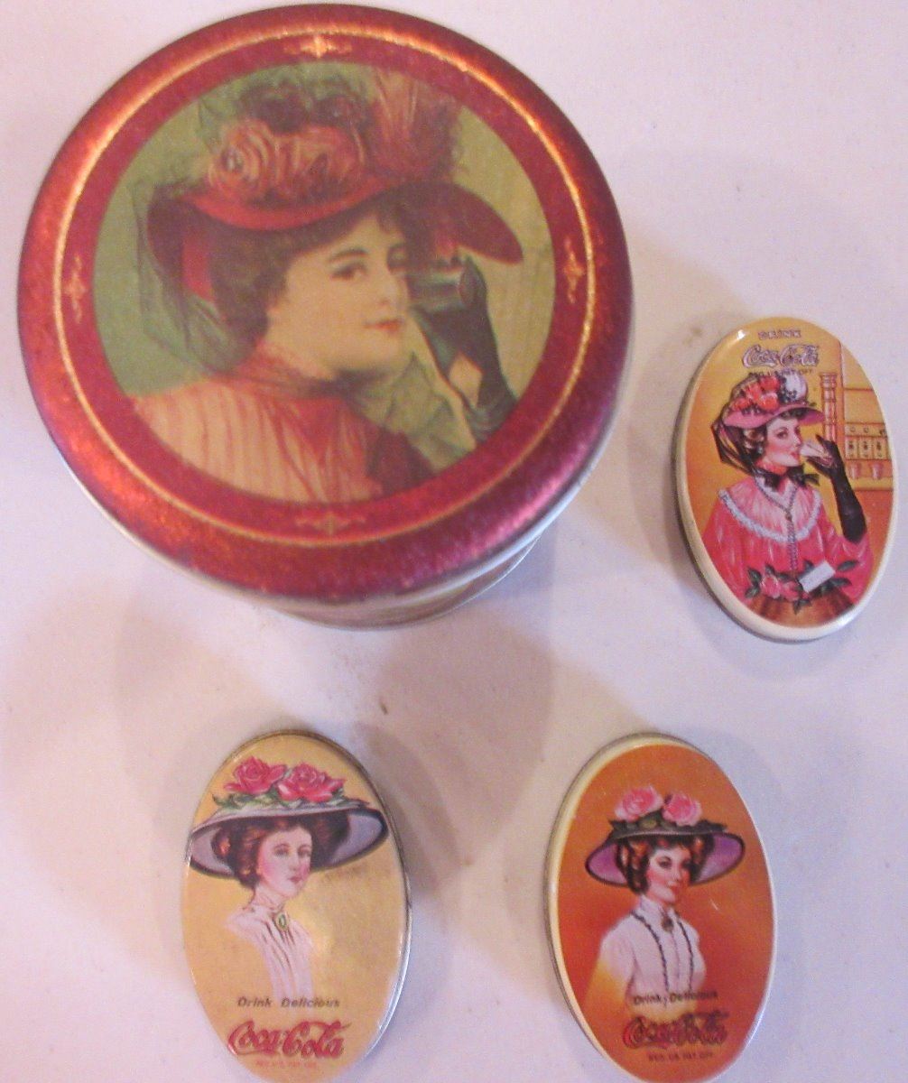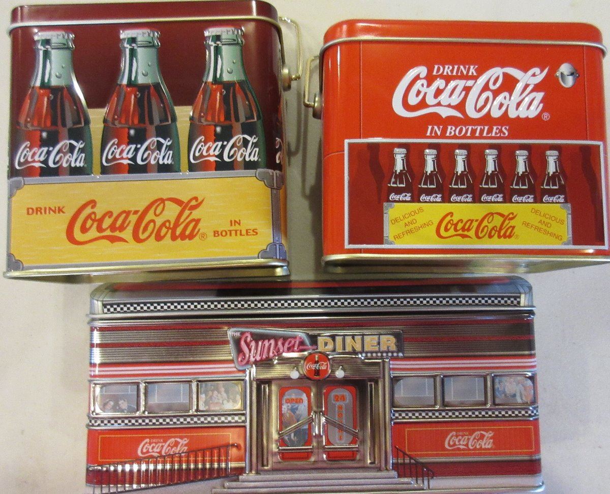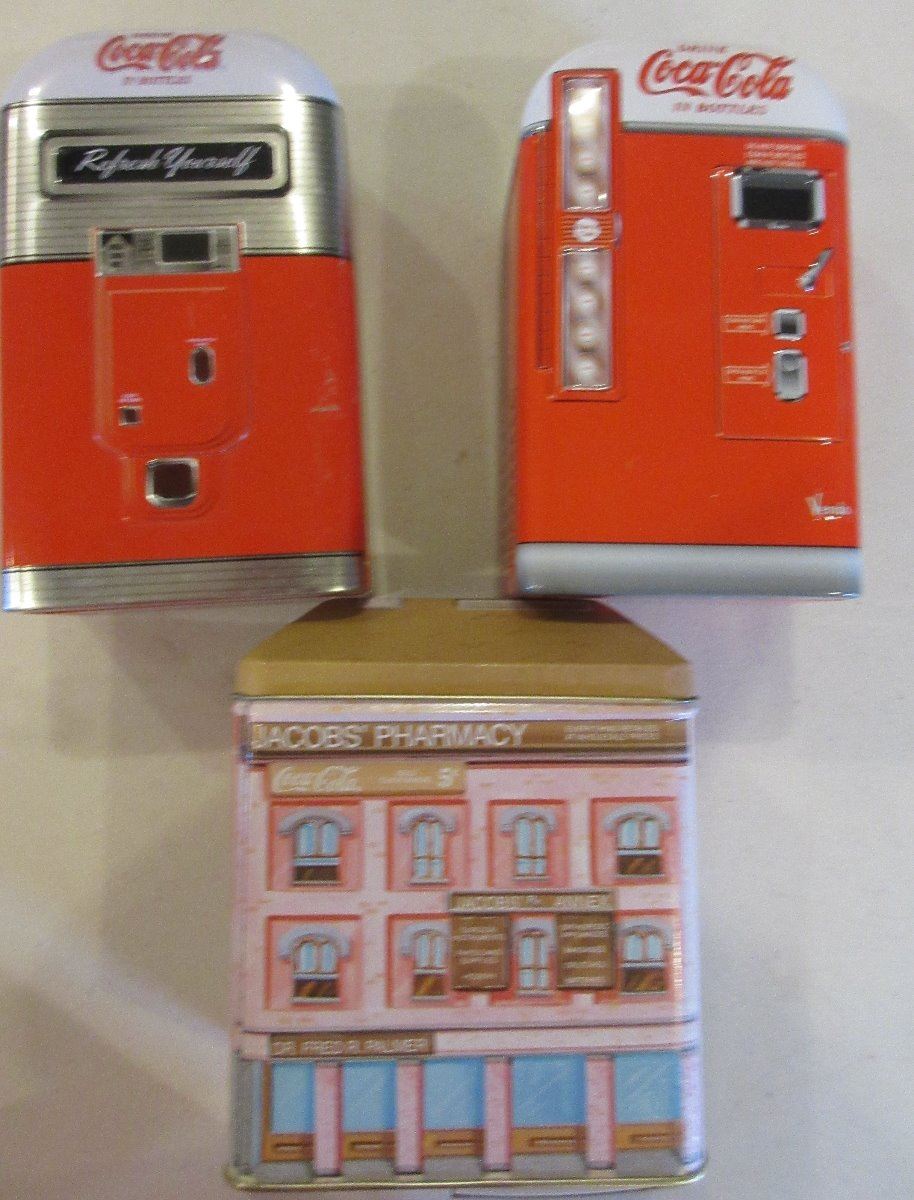 2 Coca Cola Cooler style tins with Handles, Sunset Diner Coke , 2 Coke Dispenser Style tin, 1 Jacob's Pharmacy Coca Cola