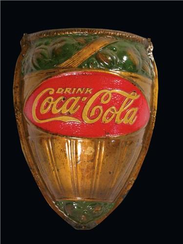 Coca Cola Wall Pocket, composition and leather. Minor paint loss otherwise very good condition. May have been shellacked. 9 X 12 inches.