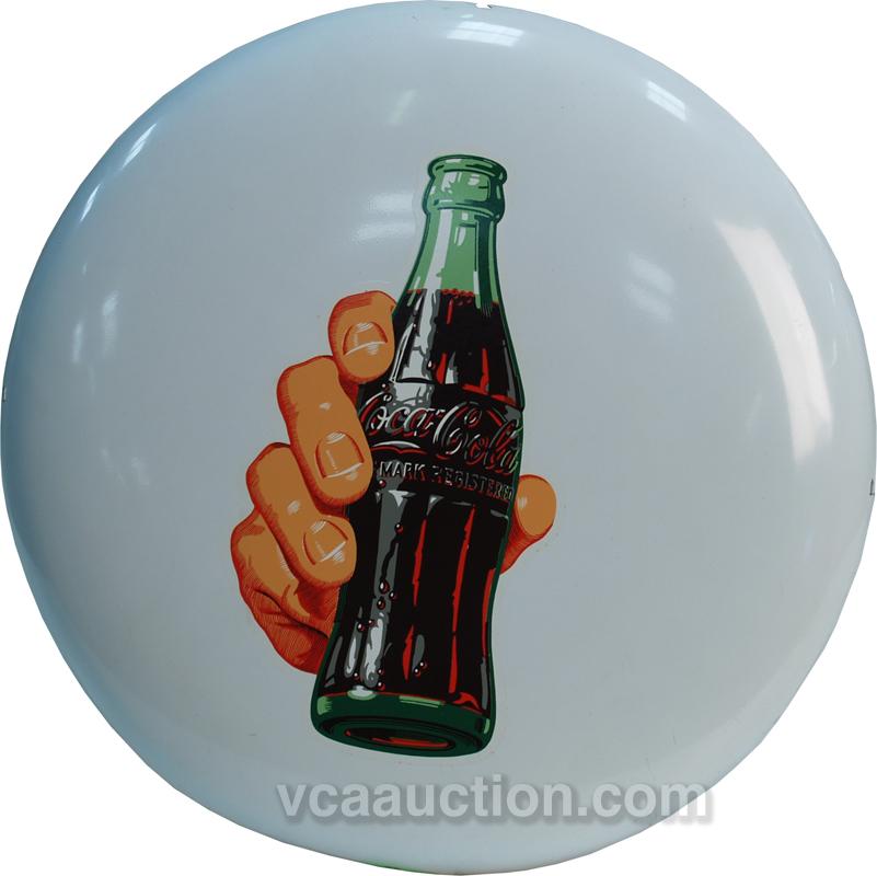 Coca Cola White Aluminum Button Sign w/ hand holding a bottle of Coca Cola, very rare - 16" diam