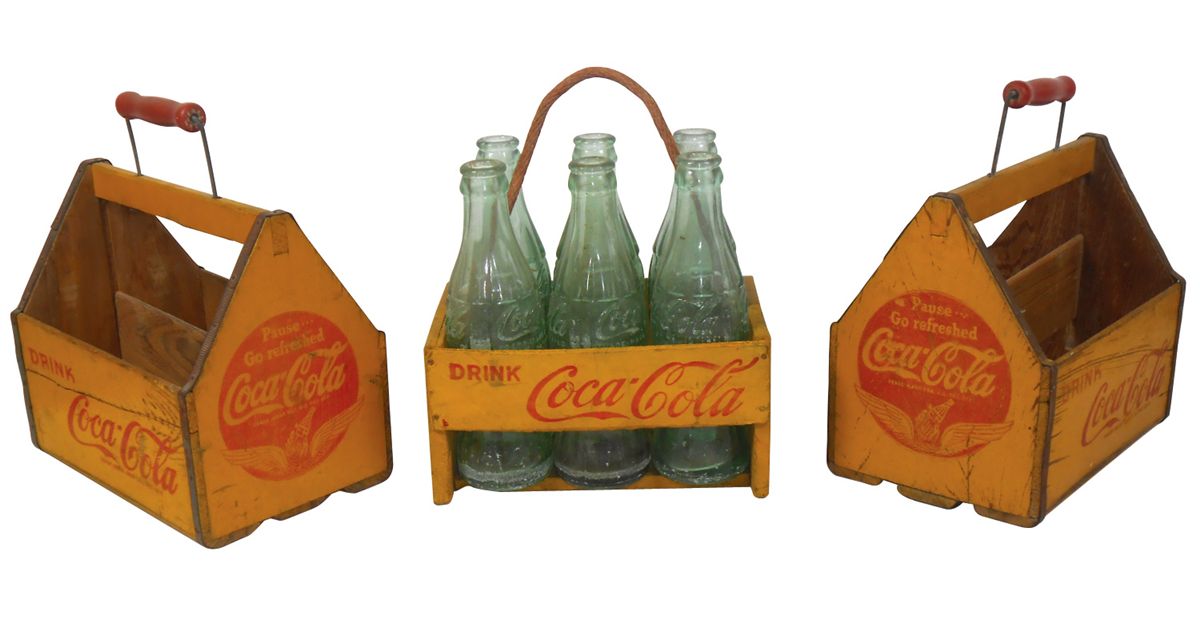 Coca-Cola bottle carriers (3), all are wood, one w/rope handle, all VG cond, 8"H x 8.5"W.