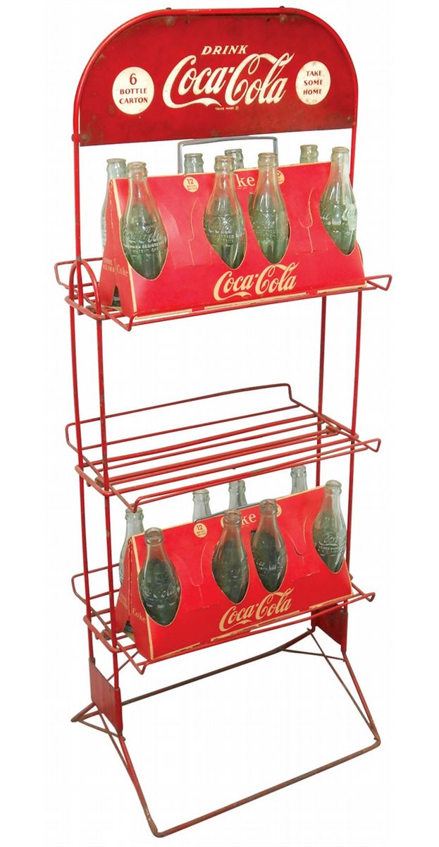 Coca-Cola bottle rack w/3 shelves & 2 cdbd 12 pack for 50 Cent carriers, c.1950, metal rack in Good/