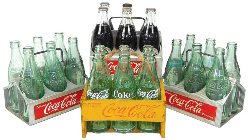 Coca-Cola carriers & bottles, 3 metal 6-pack carriers, 1 wood w/rope handle, 4-75th Anniversary bottles, etc, all VG to Exc cond, bottles are 8"H.