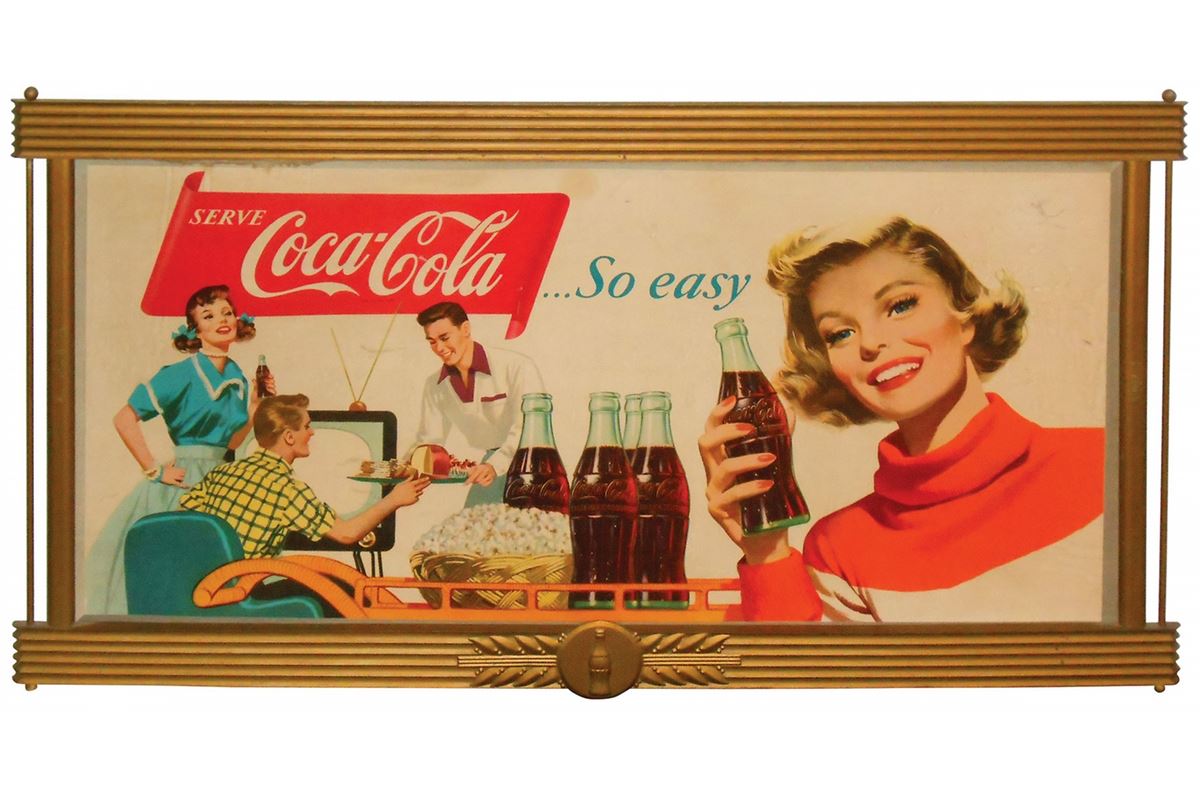 Coca-Cola cdbd sign, "Serve Coca-Cola….So Easy", in orig 1950's Kay Displays gold wood frame w/medallion, VG+ cond w/minor soil, 33.5"H x 62"W.