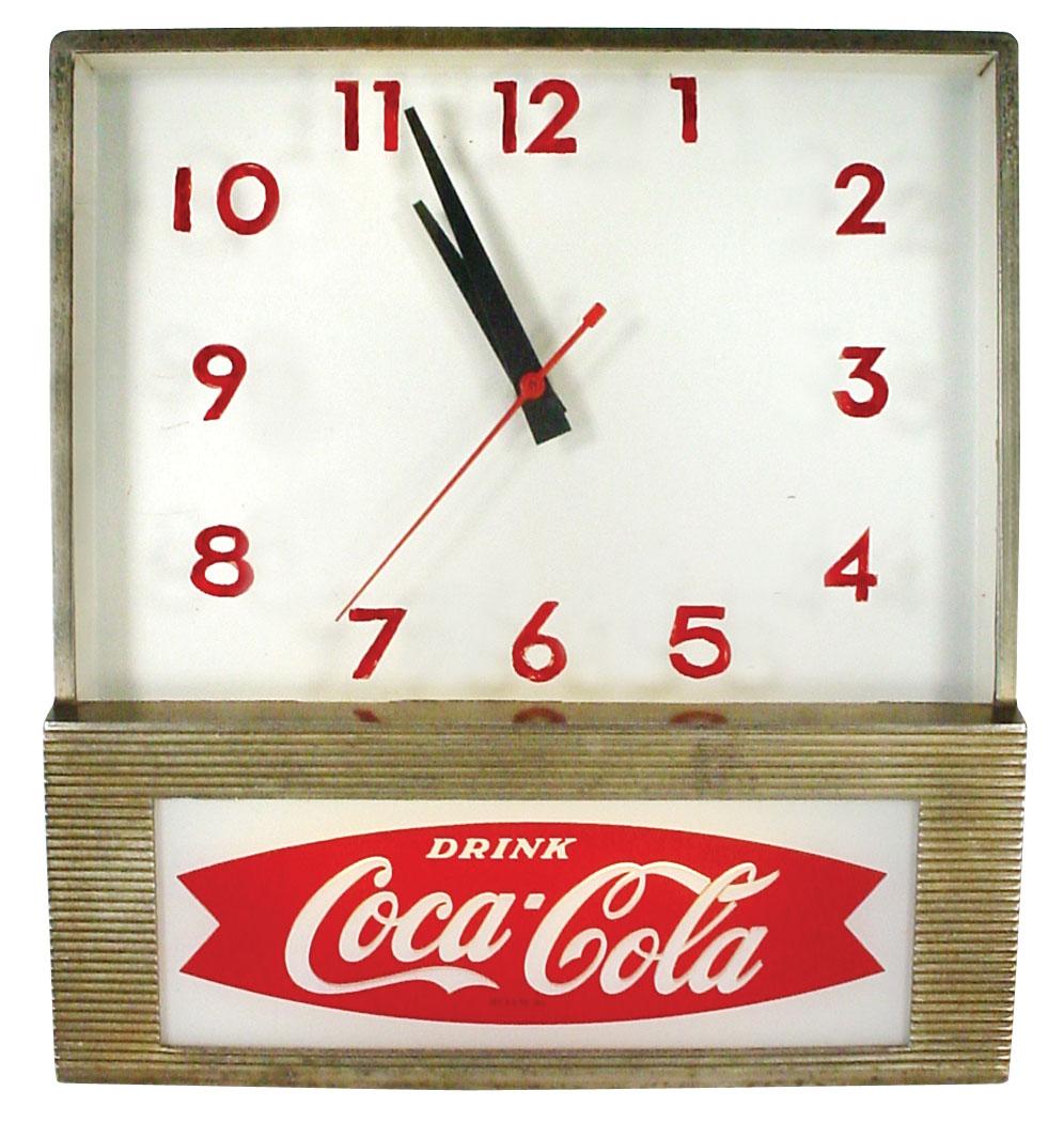 Coca-Cola clock, 1960's glass/metal light-up w/fishtail logo at bottom, VG working cond, 12"H x 11"W.