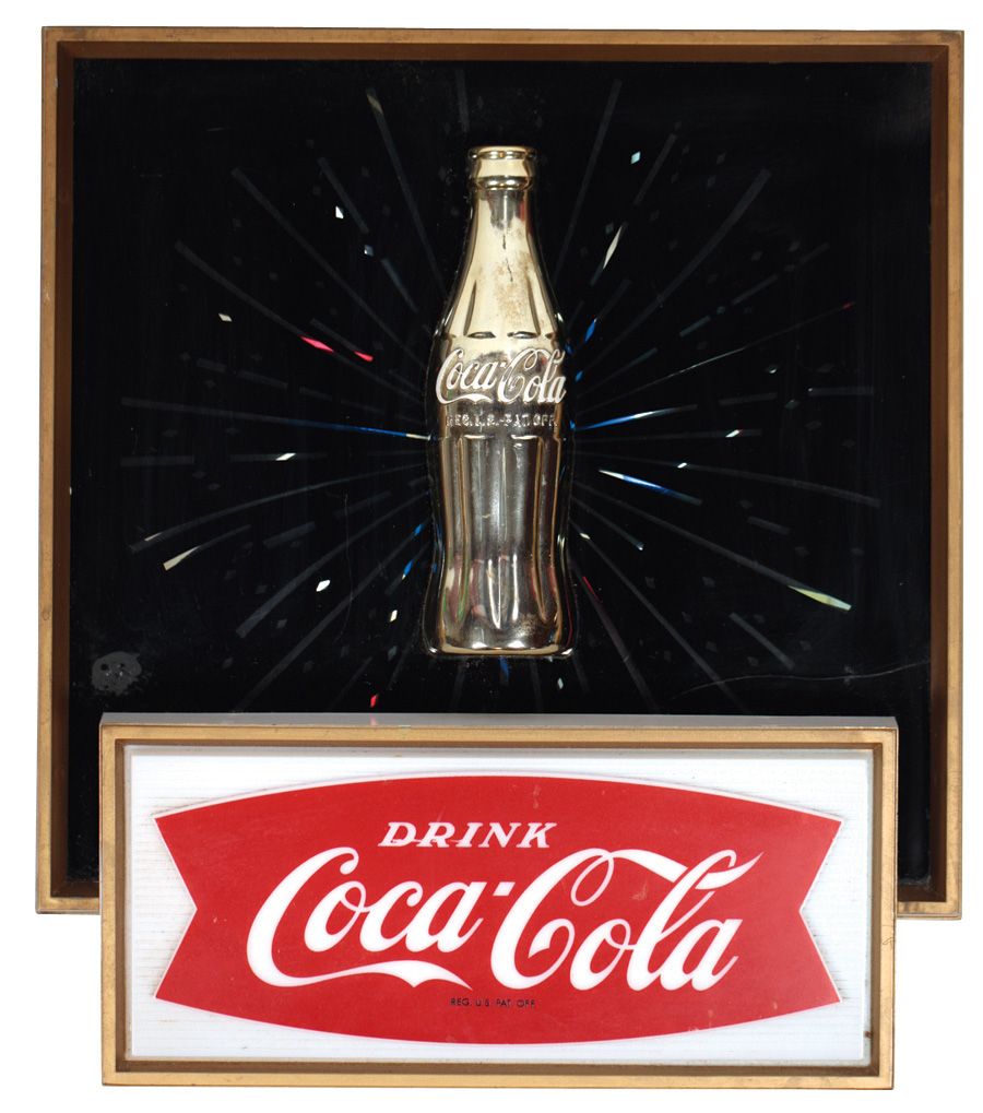 Coca-Cola fishtail light-up "Starburst" sign w/gold bottle in center, plastic housing & face, c.1960's, face has 4" crack at bottom, o/wise Exc working cond, 16"H x 14"W.