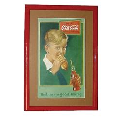 Coca-Cola litho on paper hanger sign, c.1920, boy w/hot dog & bottle, professionally framed & matted