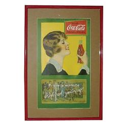 Coca-Cola litho on paper hanger sign, c.1920, pretty lady holding bottle, professionally framed & ma