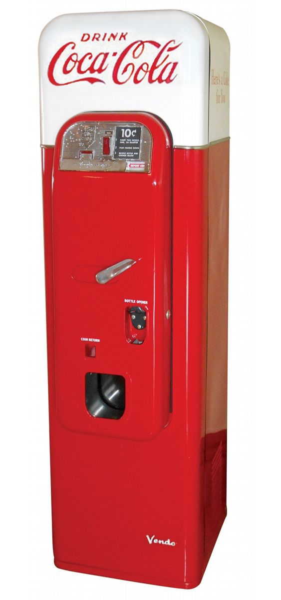 Coca-Cola machine, Vendo 44, 10 Cent, embossed front, c.1950's, vends 44 bottles, working compressor, a small desirable machine in Exc restored cond w/orig parts,, 57.5"H x 16"W x 15.5"D.