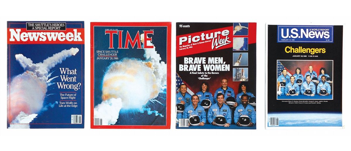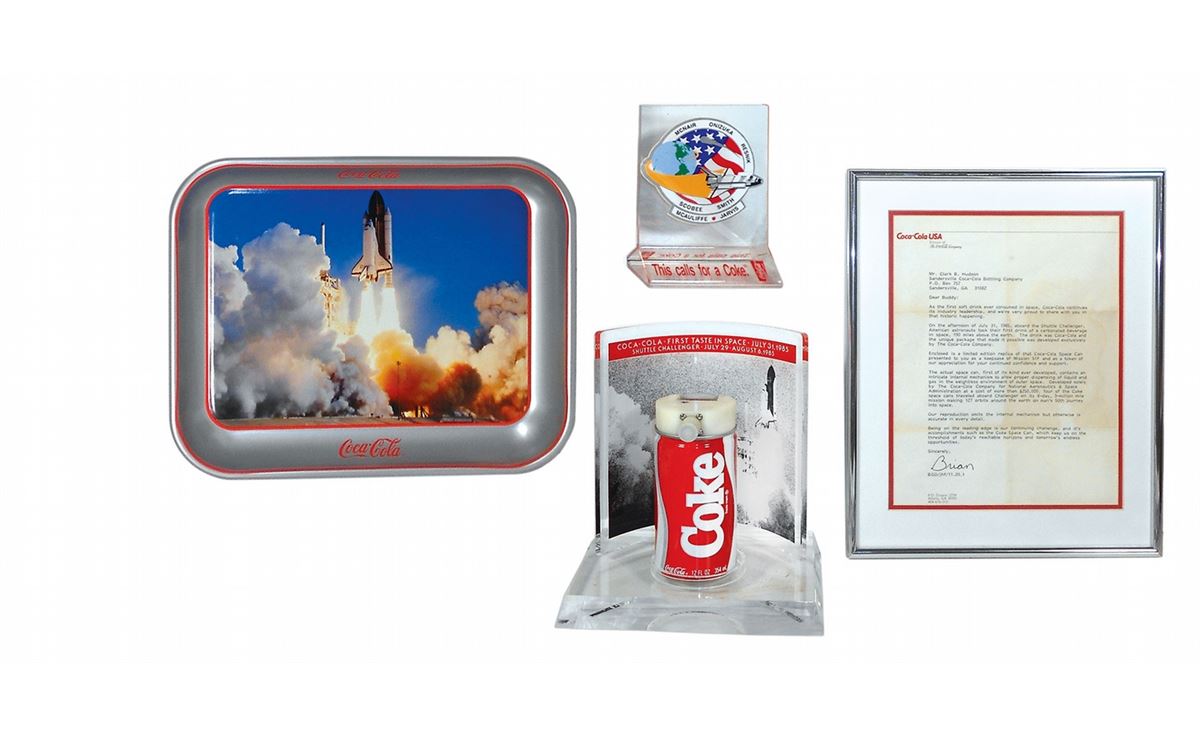 Coca-Cola mementos (8), First Taste in Space, July 31, 1985, Shuttle Challenger limited edition replica can in plastic display & orig box, display Exc cond/Box VG+ cond, 9.25"H x 8.75"W x 6.95"D; framed letter regarding historic display from Coca-Cola USA, VG cond, frame 13.75"H x 11.24"W; paper documents w/details about can development; 3 periodicals featuring Challenger disaster, sm Lucite display w/names of 7 astronauts & 18th convention CCCC tray, 1992, Exc cond, 10.75"H x 13.25"W.
