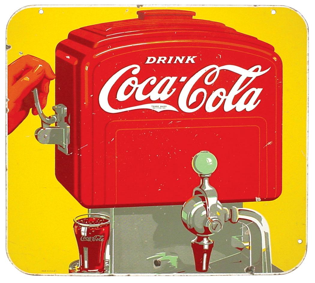 Coca-Cola porcelain dispenser sign, 2-sided hanging sign w/countertop dispenser graphics on both sides, one side is Good w/tiny scratches, other side is Fair w/significant scratching, 26"H x 26"W.