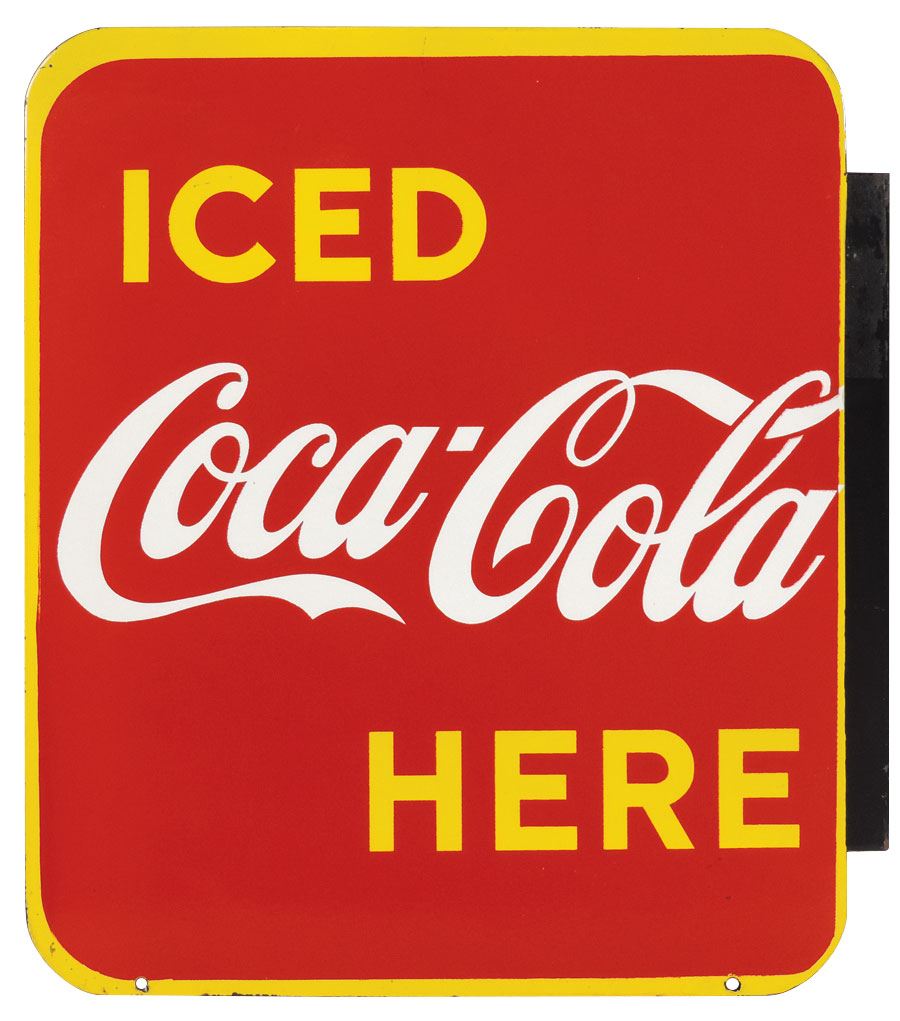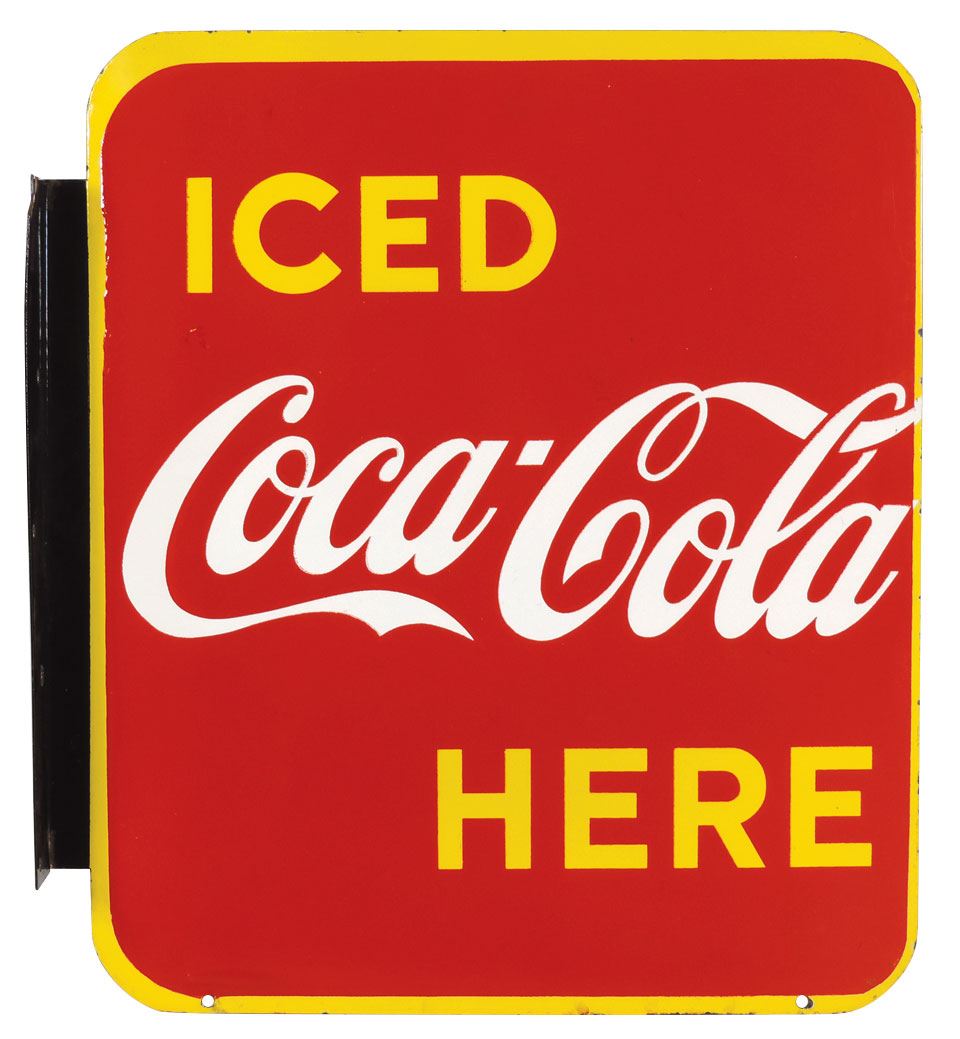 Coca-Cola sign, Iced Coca-Cola Here, porcelain 2-sided flange, c.1949, Exc cond, 19.25"H x 17"W.
