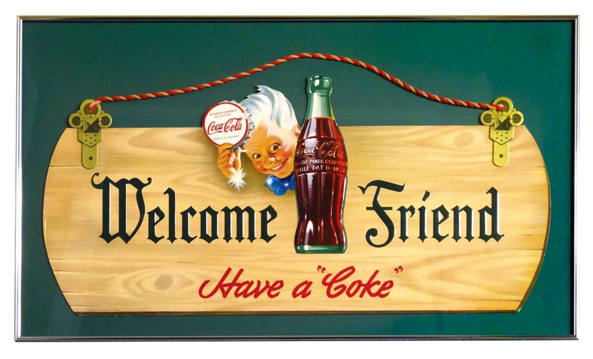 Coca-Cola sign, Welcome Friend w/Sprite Boy, framed diecut cdbd, overall Exc cond & color w/some crazing on Welcome Friend letters but does not detract, 19.25"H x 33.5"W.