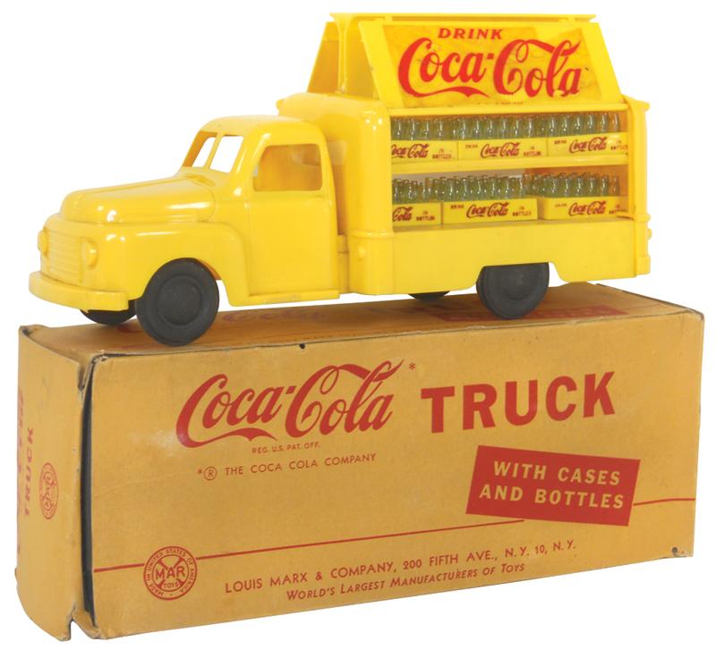 Coca-Cola truck, mfgd by Marx, yellow plastic w/6 cases of bottles, c.1950, VG cond w/orig box, 11"L.