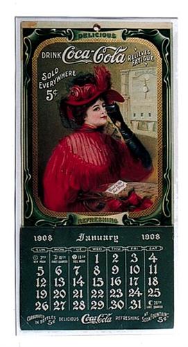 This is a gorgeous example and appears to have a complete 1908 pad. It is beautifully matted and framed under glass, measuring 7"x14". This is the exact piece pictured on page 51 or Petretti's 10th edition. Being critical call cond. 8.5, but displays much better. Minor stain and crimp upper left corner, a few minor surface marks 3-4 minor surface crimps and bends. Otherwise, only light soiling on the face of the calendar. Wonderfully retained glossy enameled finish remains. Along with strong, vibrant unfaded colors. Call cond 8.8 but displays as a 9.5+.