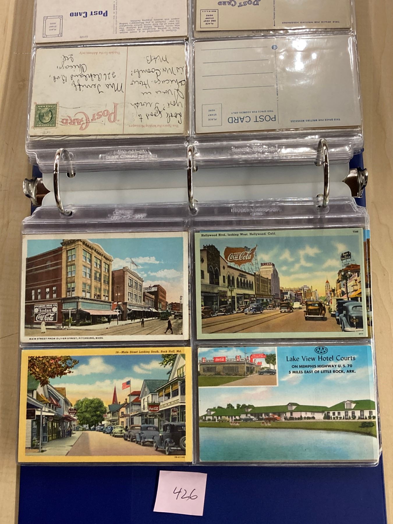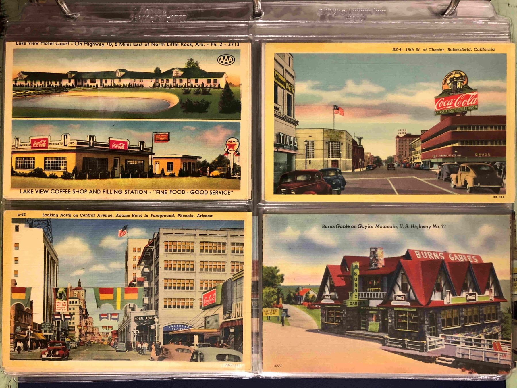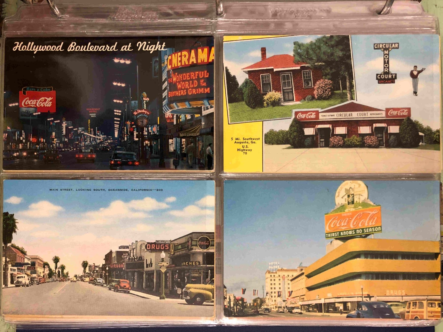 Album of approx. 100 cards showing Coca-cola signs. From all over the USA. Early to standard size chrome. Street Scenes, restaurants, interiors, gas stations, etc.