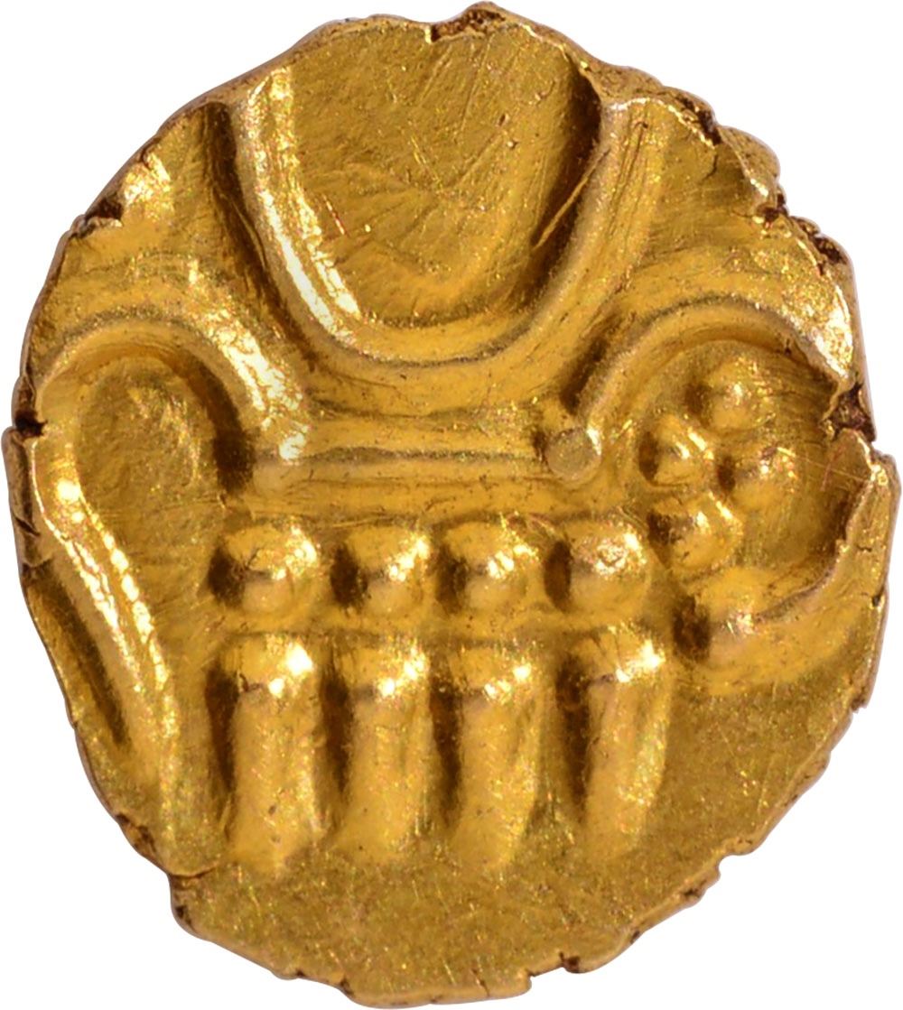 Cochin, Unattributed, Gold Vira Raya Fanam,Obv: a crude depiction of a lion walking to the right, a crescent symbol above, Rev: jingal above 3 rows of dots, 0.34g, 8.45mm (Herrli # 1.14), Uncirculated, Scarce.