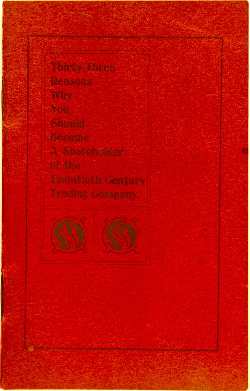 A 22-page, 3 x5" booklet describing "Thirty-three Reasons Why You Should Become A Shareholder of the Twentieth Century Trading Company." The company has holdings in Arizona and Ontario, the latter of which are gold bearing quartz veins. The copper properties are the Copper Prince and Copper Flame claims in the Dragoon Mountains of southwestern Arizona. Probably circa 1880-1900.