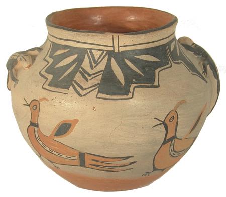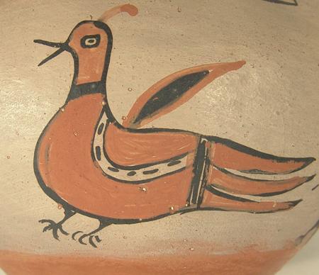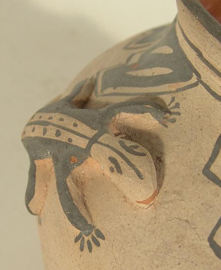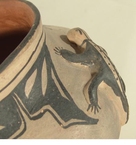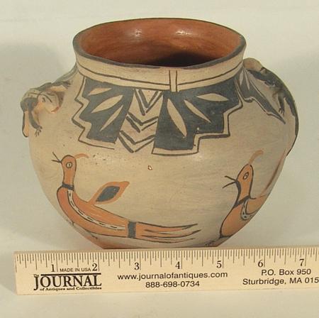 Outstanding polychrome jar with quail encircling the jar and a 3-dimensional lizard mounted on the side. Condition: excellent. 5-1/2" x 7"