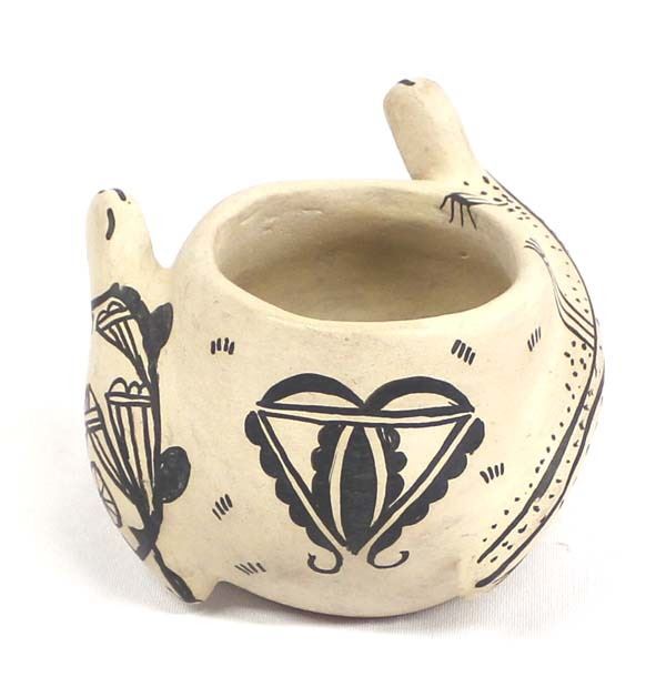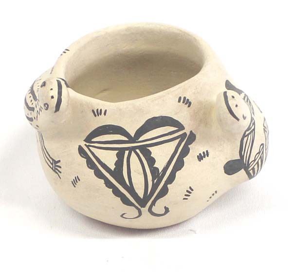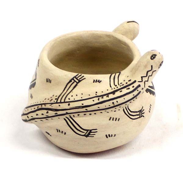 Native American Cochiti Lizard Turtle Pottery Bowl by Snowflake Flower (1931-2018), measures 4'' x 5'' and is signed on the bottom, beautiful thick walled pottery, also has a design painted inside, FYI: ''Snowflake Flower (Stephanie Rhoades) was a well known traditional potter and storyteller maker from Cociti Pueblo, New Mexico. Snowflake Flower has been making storytellers and traditional pottery since 1977. She often puts Prayer Feathers on her storytellers in honor of her daughter who had been in a coma for 16 years until December 1999. Snowflake Flower has won awards at Santa Fe Indian Market and the New Mexico State Fair.''