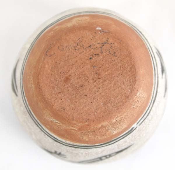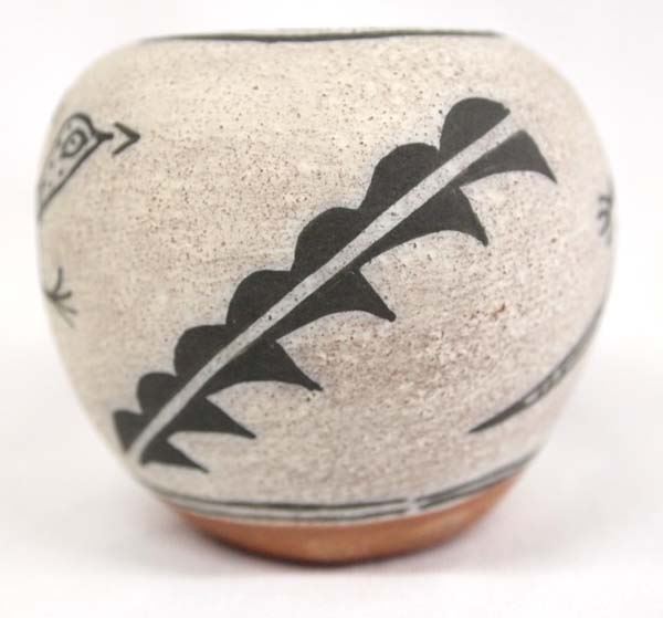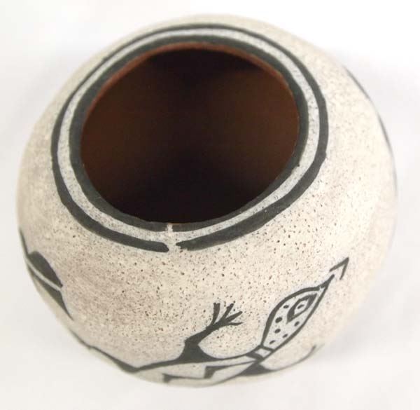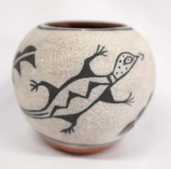 Native American Cochiti Lizard Jar, measures 3''D x 2.5''H, features lizard and leaf designs, signed Cochiti