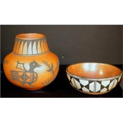 Cochiti Pot & Bowl signed M. Garcia. Pot is 8" tall. Bowl is 3" tall x 7.5" wide. Estimate $600-$800.