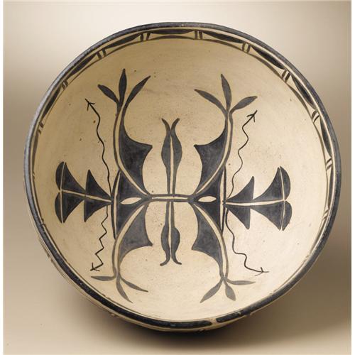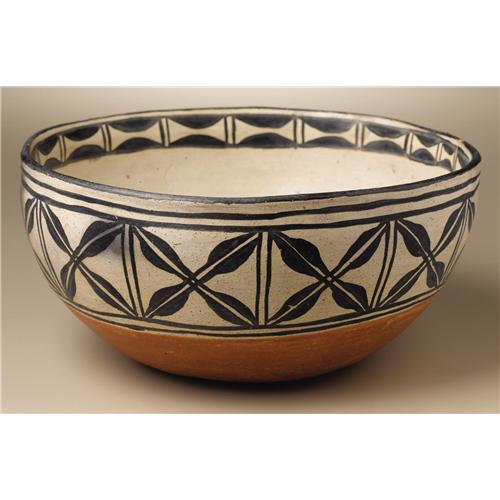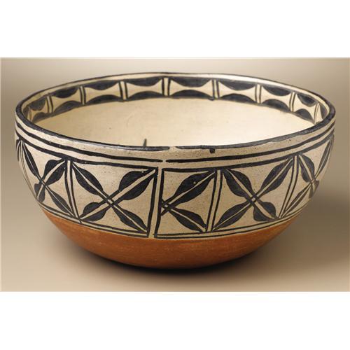 <B>Cochiti Pottery Bowl</B></I><BR>Circa 1940<BR>Height 4 1/2 in. Width 9 in.<BR><BR>This flaring bowl has an interior arrangement of symmetrical stylized plant forms, split feathers, and lightning bands. A frieze of boxed scallops decorates the interior rim. The exterior is painted with a band of split, four leaf blossoms.<BR><BR>Provenance<BR>Bonhams & Butterfields, Sale 7477E, Lot 3334, December 8, 2003.<BR><BR> <BR><BR><B>Important