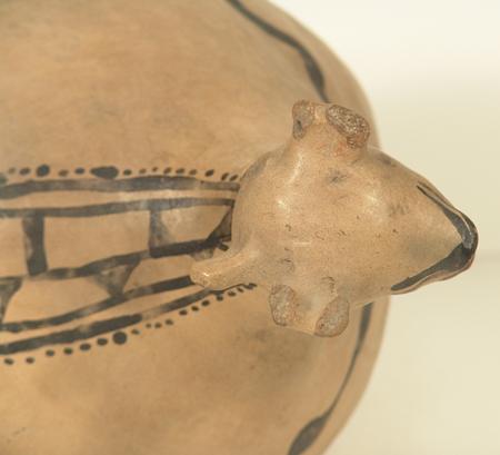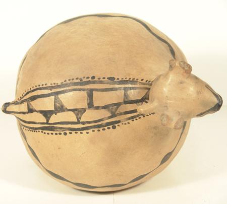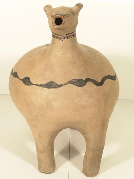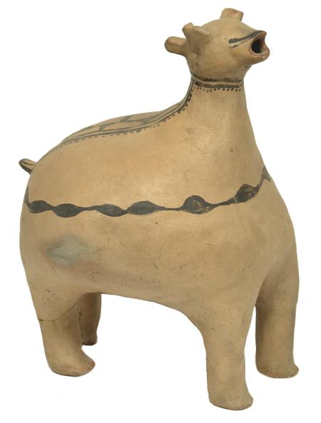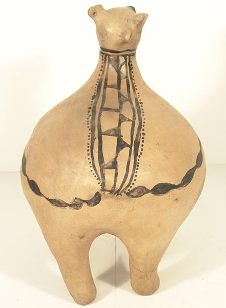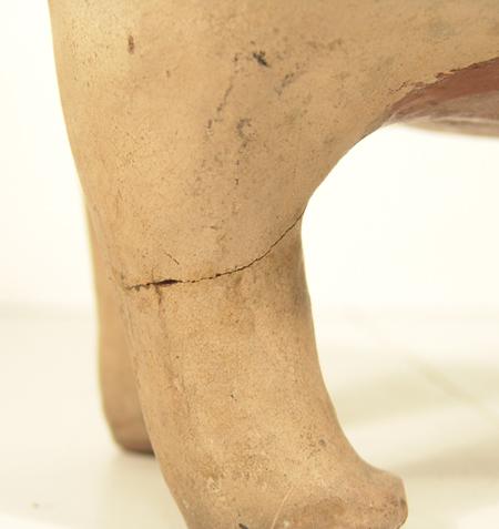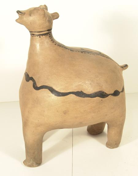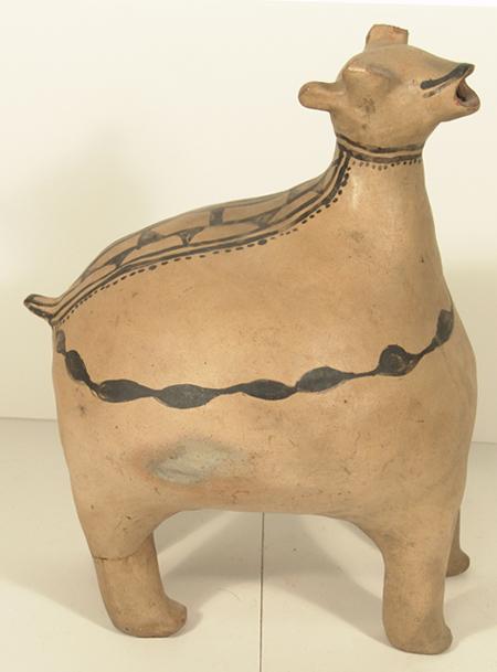 Very rare large-scale animal figure with bulbous body, small head with painted whiskers, neck band, and design down the back. Purchased from Buffalo in 1979 for $600; appraisal value $3,500. Original antlers and ear missing, back leg broken and glued back
