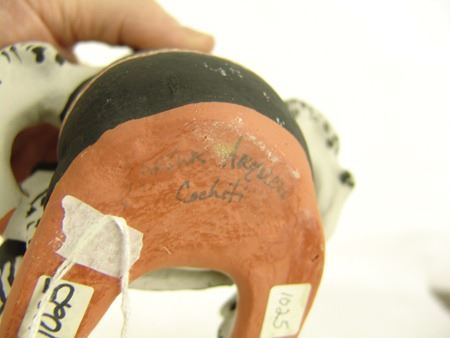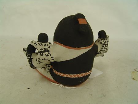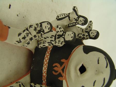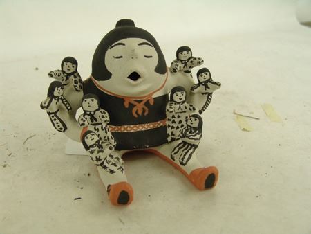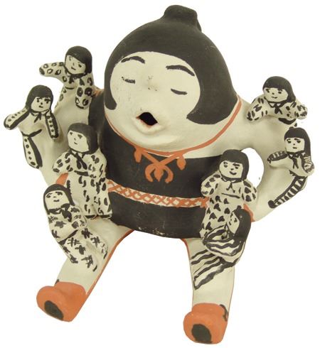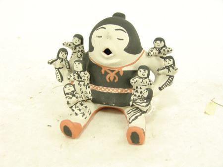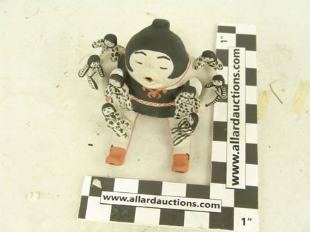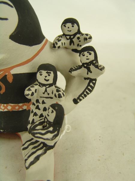 Ca. 1980s, Small traditional polychrome open mouthed storyteller figure shown seated and with eight babies listening. Very good condition, minor surface scuffs. 5-1/2"