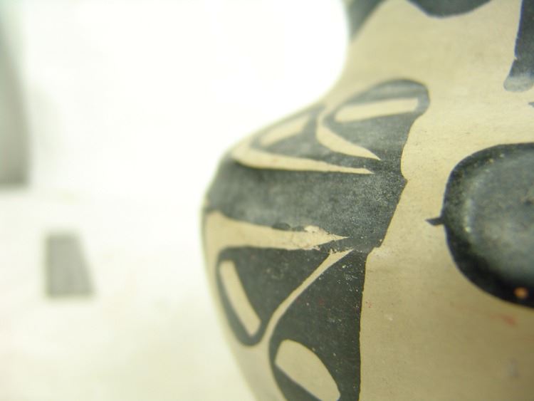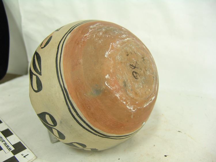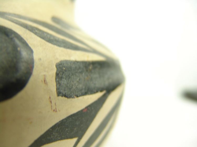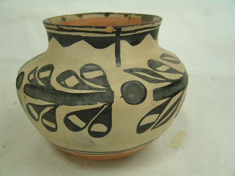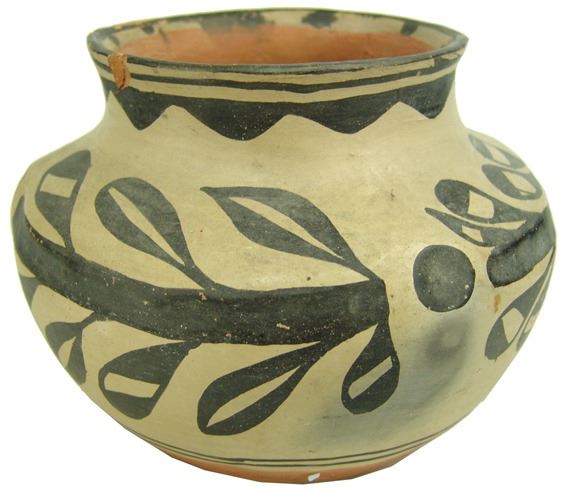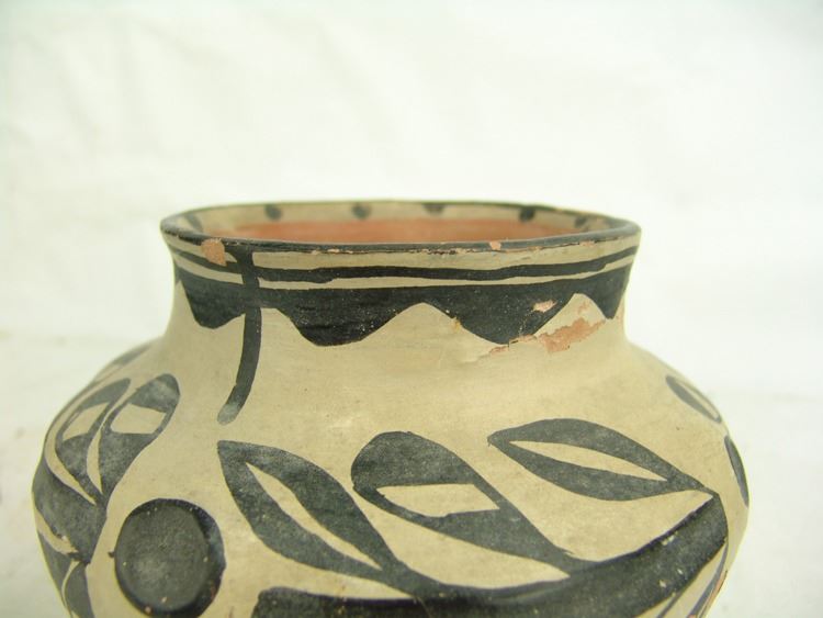 Great old well used polychrome pottery olla with red base and interior floral designs and rare fluted stems on the florals. Good condition with some rim chips and some dings from use.,Early 1900s,7" x 9"