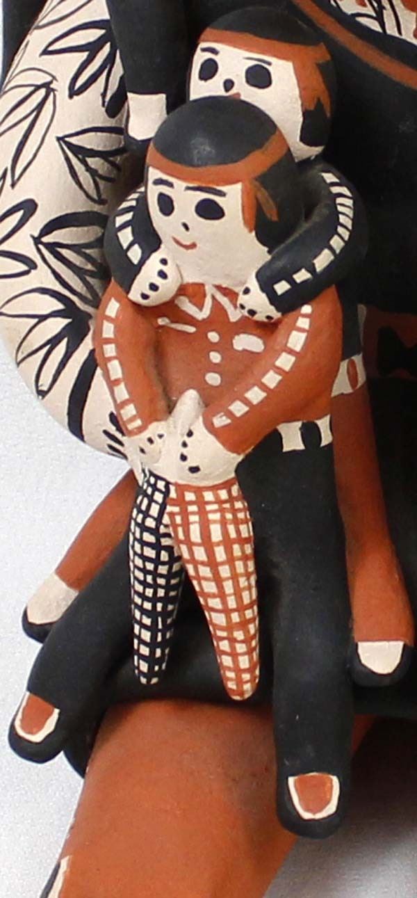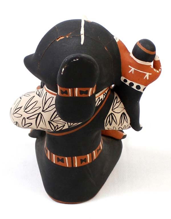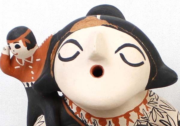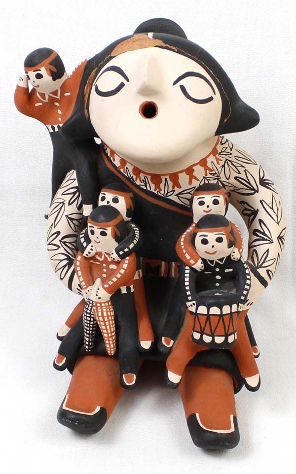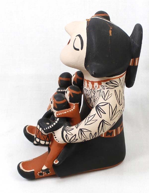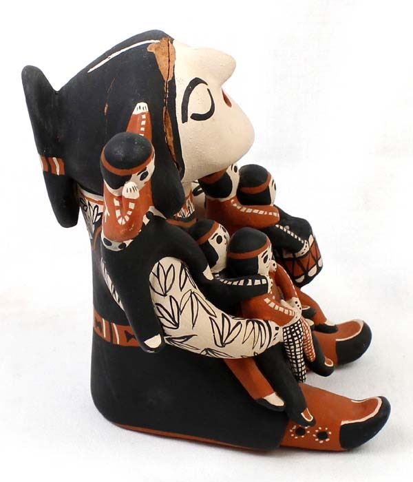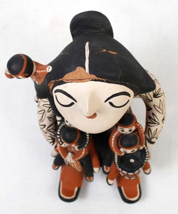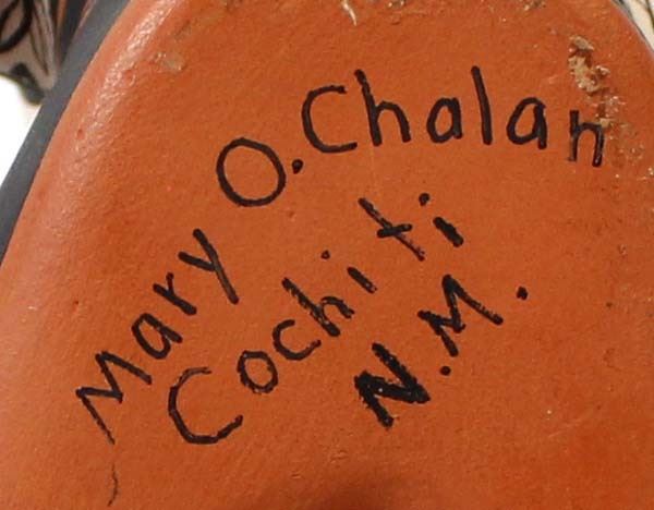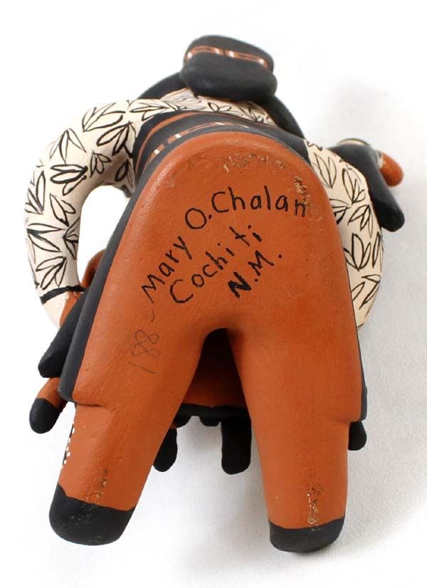 Native American Cochiti Pottery Storyteller Doll by Mary O. Chalan, measures 6'' x 8'' x 6'' and is signed on the bottom, her face and top part of her head has been glued, FYI: ''Mary O Chalan was born into the Cochiti Pueblo of New Mexico on Aug. 21, 1939, and was taught the art of working the clay by her famous mother-in-law, Helen Cordero. Mary has won numerous awards including Honorable Award at the New Mexico State Fair and blue ribbons from Colorado and Arizona. She has also been featured in numerous publications.''