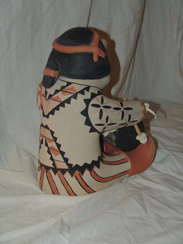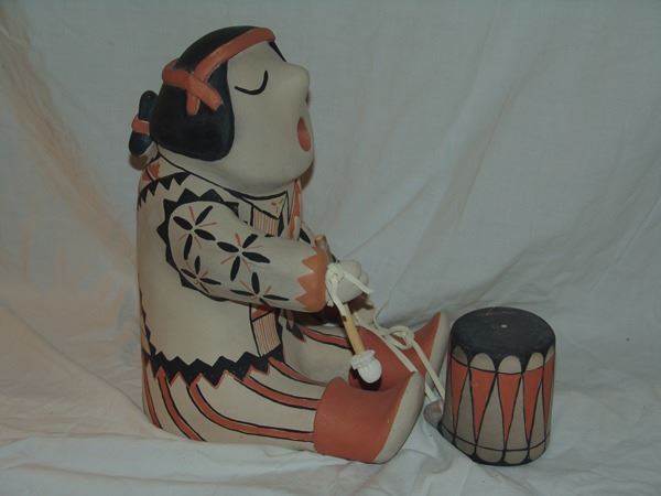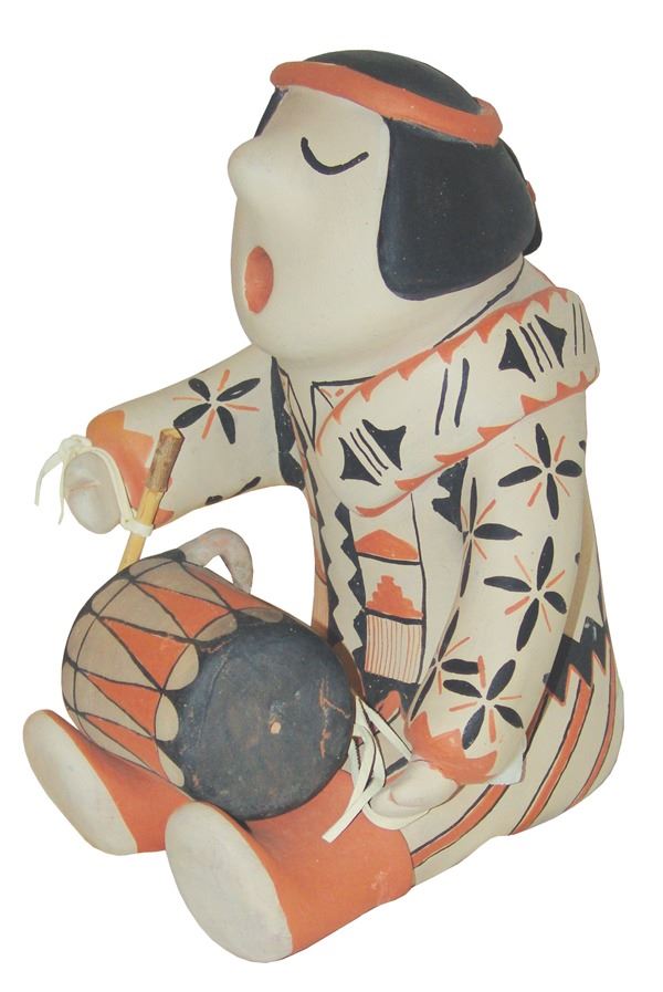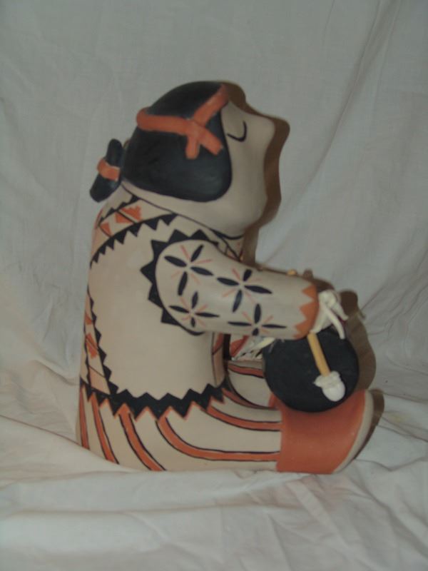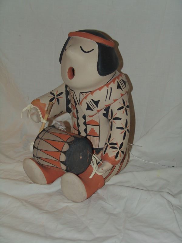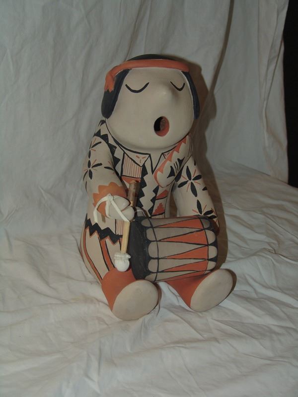 Impressive, hand formed pottery "storyteller" figure, this a seated drummer shown singing with its mouth open, holding a large drum. Very good condition, minor scuffs.