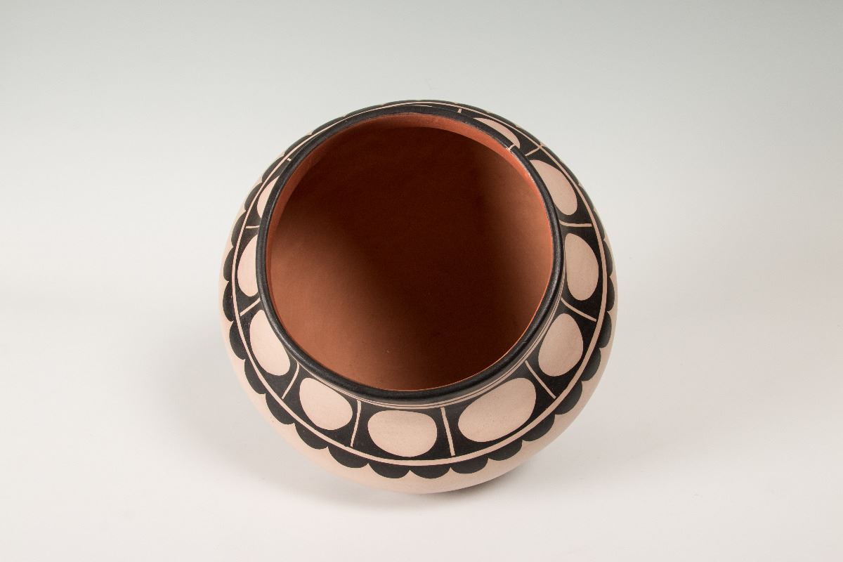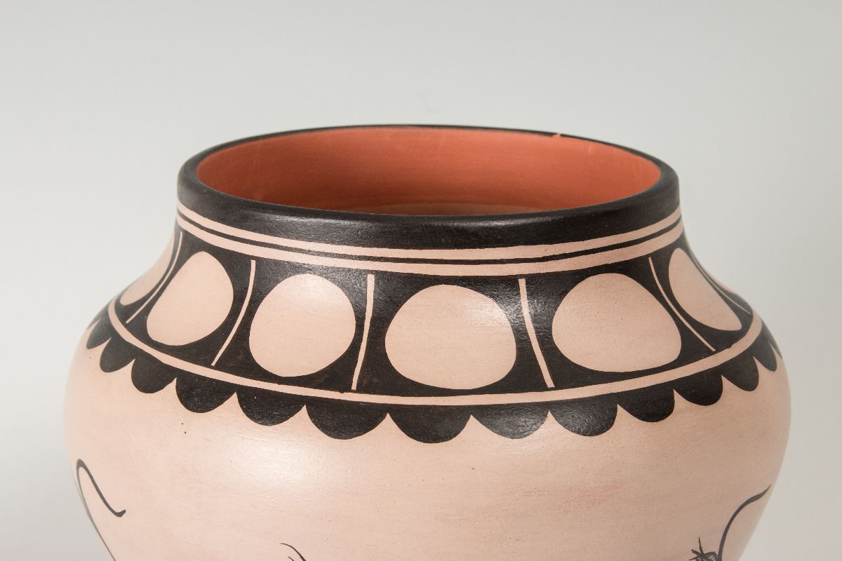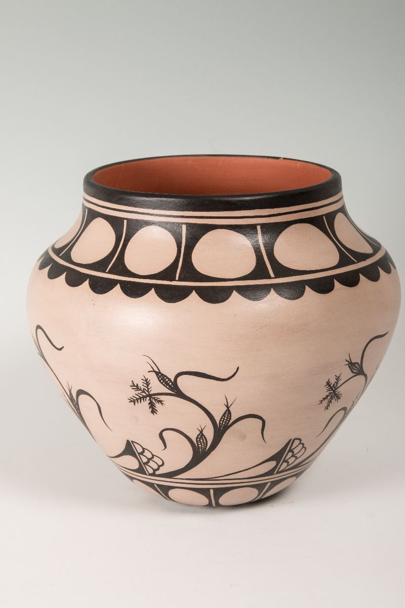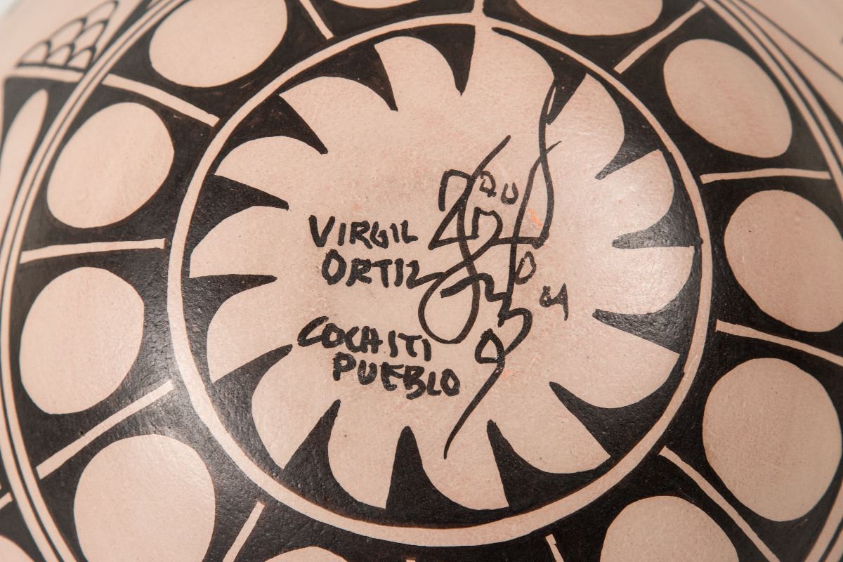 Cochiti Pueblo Pot by Virgil Ortiz (1969 - ). 9 ¼" x 11" polychrome pot with cornstalk designs. Signed on bottom: Virgil Ortiz, Cochiti Pueblo.