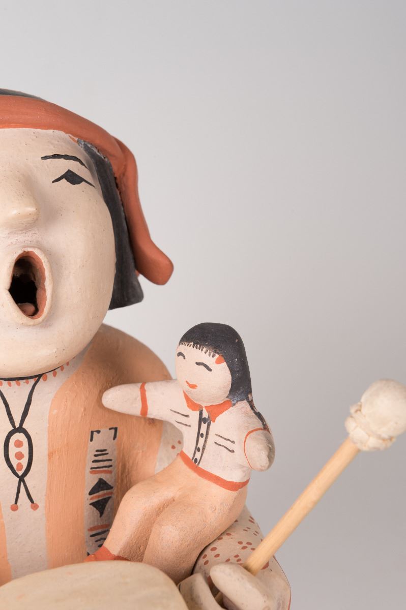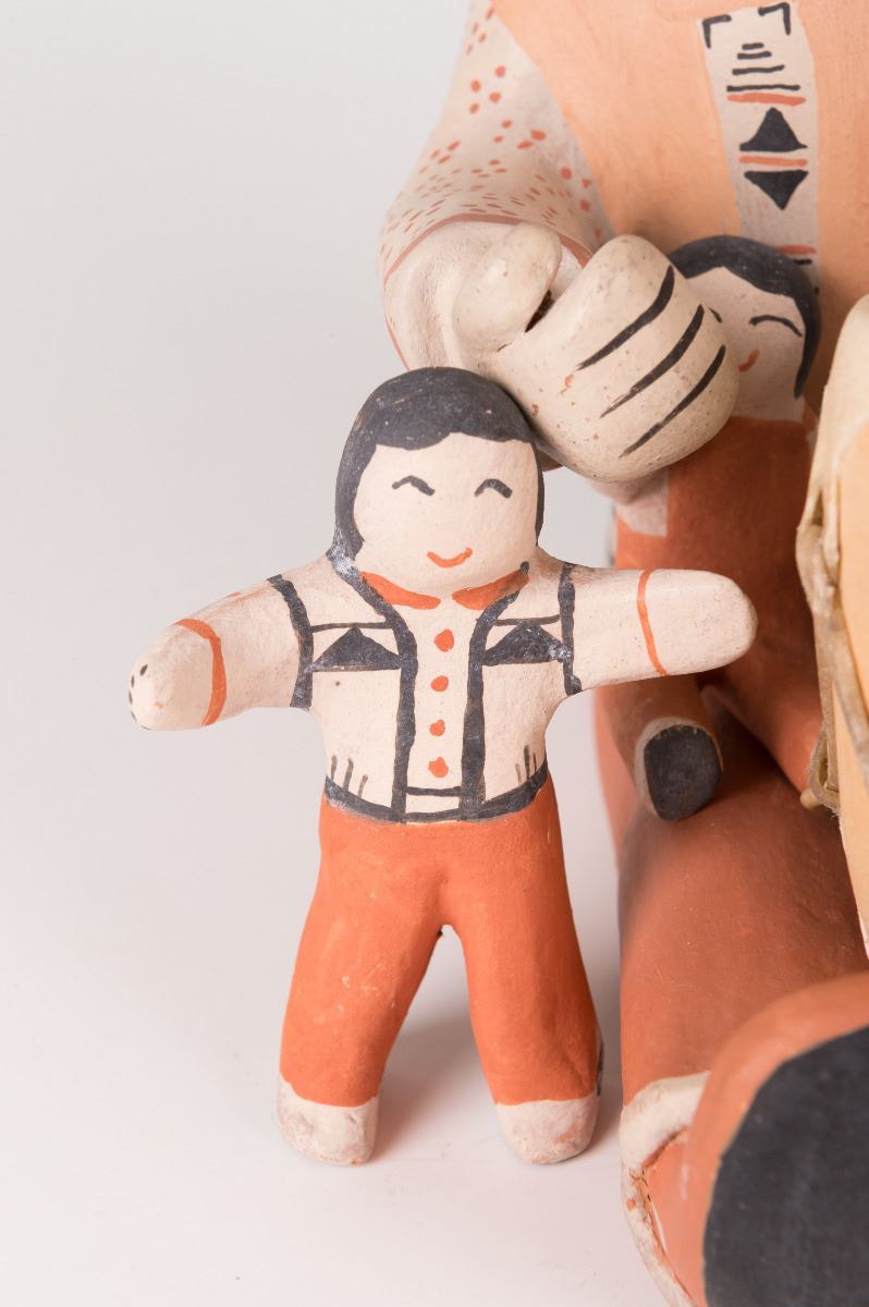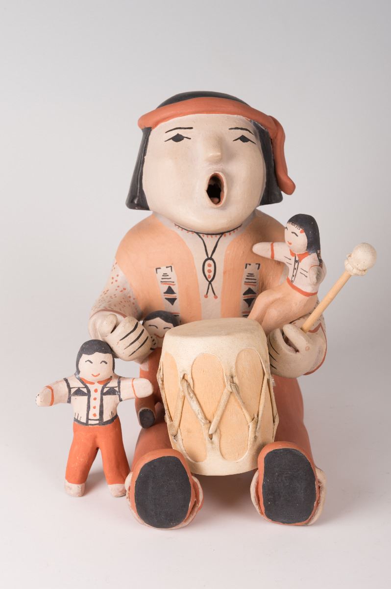 Cochiti Pueblo Storyteller Dolls by Ada Cordero Suina (1930 - ). 9" x 6" x 8" large Storyteller doll with three (detached) children, a drum and drum beater. Signed on bottom: Ada Suina, Cochiti Pueblo, 1979.