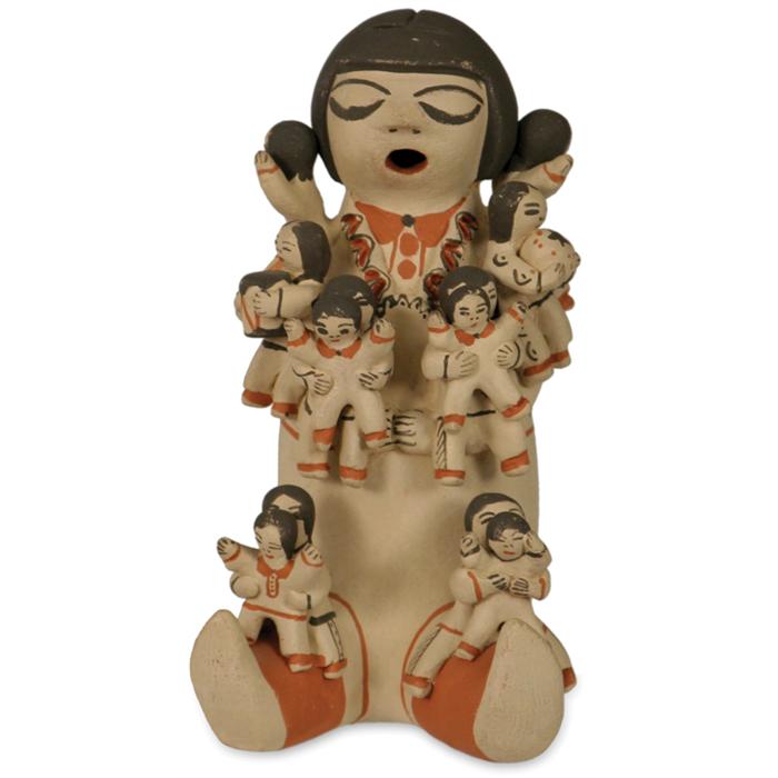 Cochiti Storyteller. 10" tall, 5 1/2" wide, 6" deep. Pueblo pottery. Woman with twelve children. Signed Mary Trujillo on bottom. Some of the signature is worn. (est $2000-3,000)