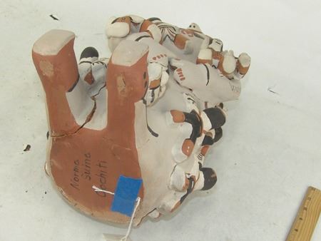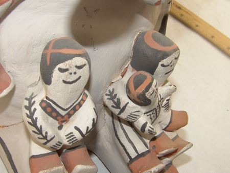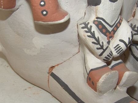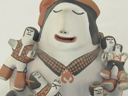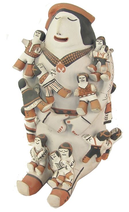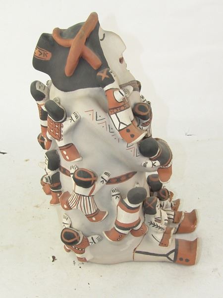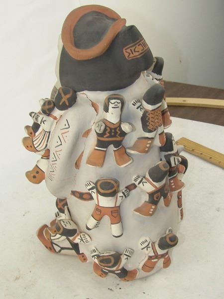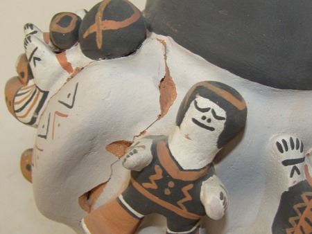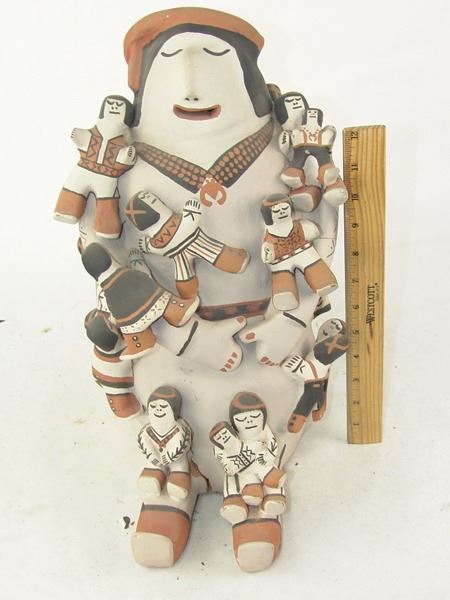Ca. 1970s-1980s, Large and busy seated storyteller pottery figure with 21 attached children. This is a nice, large example, but has been damaged and glued back together. 15-1/2" x 10" x 9"