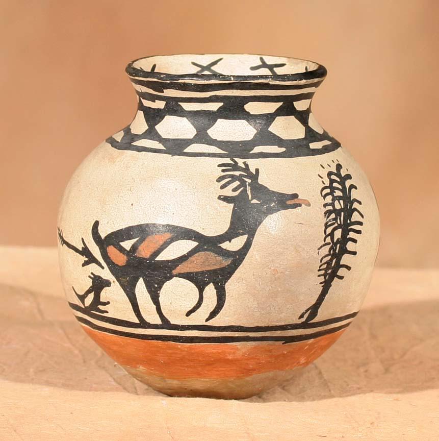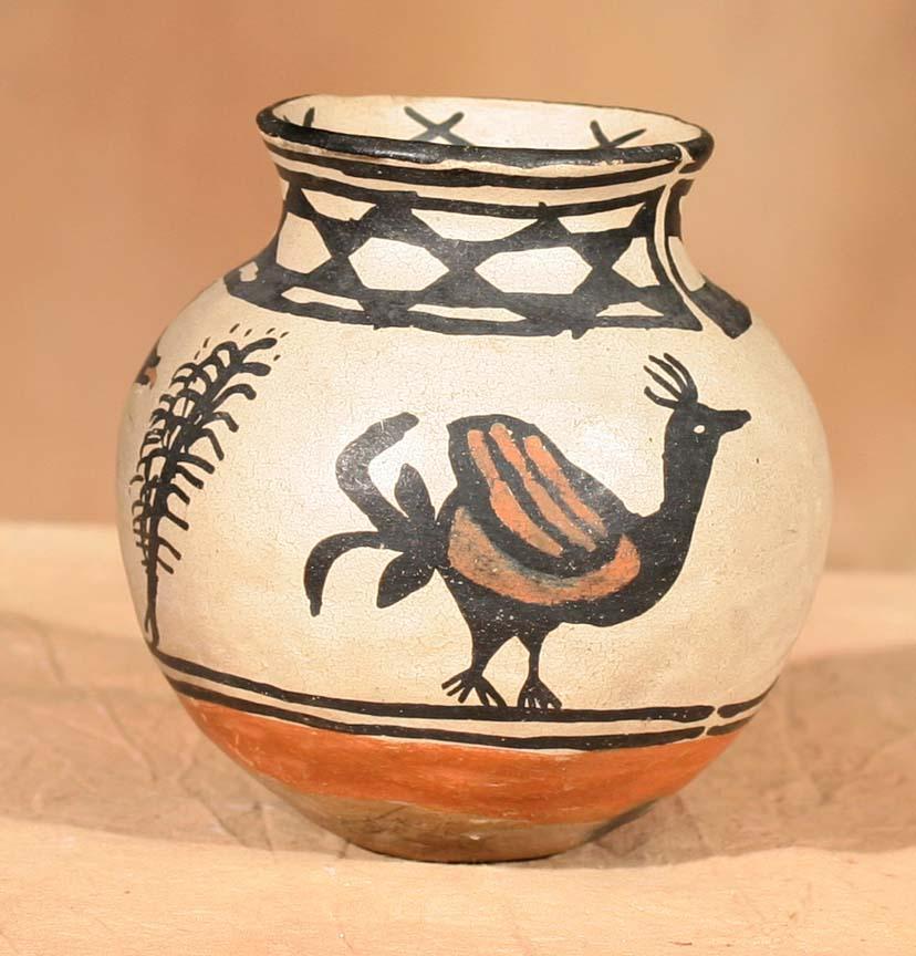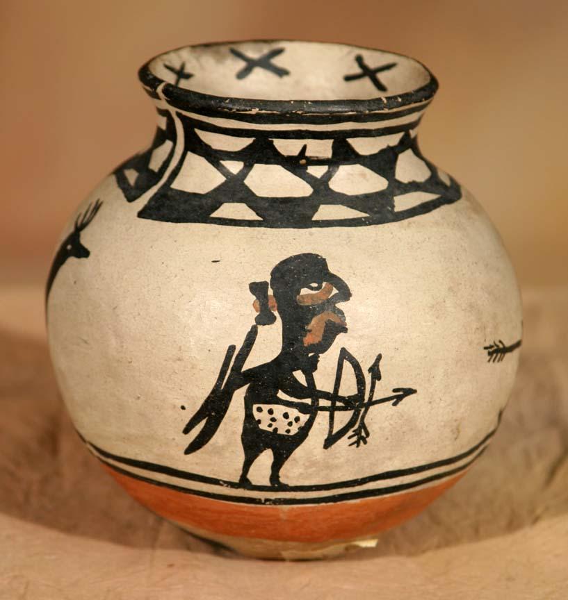 Cochiti or Santo Domingo Figurative Jar. 5 ½" x 5 ½". Polychrome with hunting scene and bird designs. Thick secondary red band above base. Circa 1890-1900. (est $700-1,200). Provenance: Bethany College, Lindsborg, KS. For condition reports please visit: www.auctioninsantafe.com/cr2011.pdf
