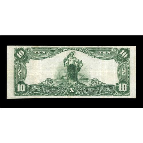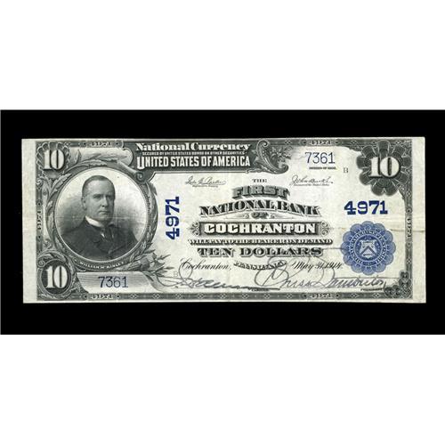 <B>Cochranton, PA</B></I> - $10 1902 Plain Back Fr. 623 <B>The First NB </B></I> Ch. # 4971<BR>The census from this Crawford County locale is only three large size examples. The note we offer tonight is bright and enjoys easily legible stamped signatures. The amount of its large size circulation still unredeemed as of 1935 was only $2,750, making it unlikely that any significant additions to the census will be made. <B>Very Fine.</B></I>
