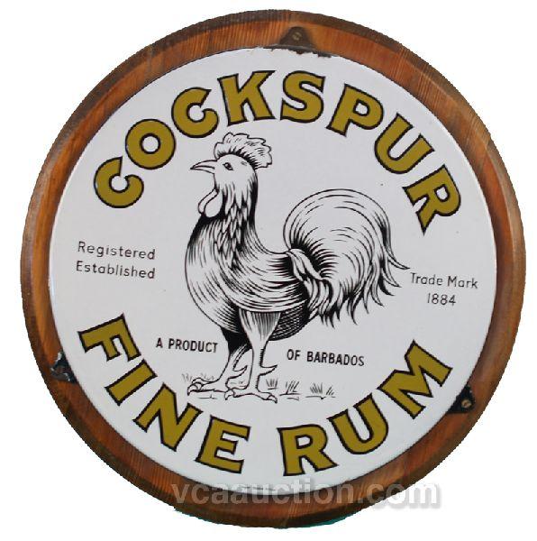 Cockspur Fine Rum Round Porcelain Sign "A Product Of Barbados", mounted on old wood barrel topper - 15" diam