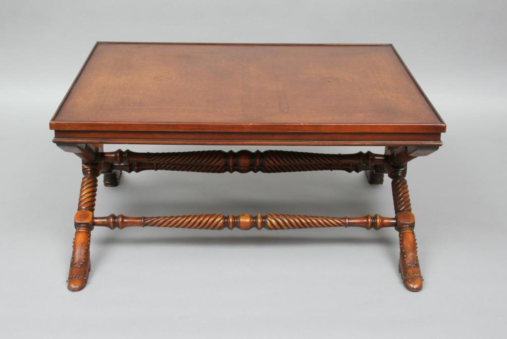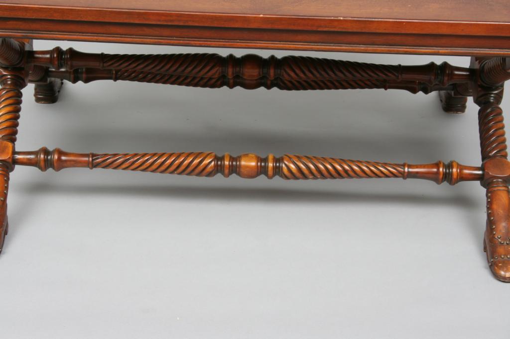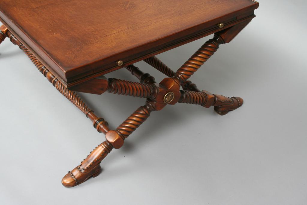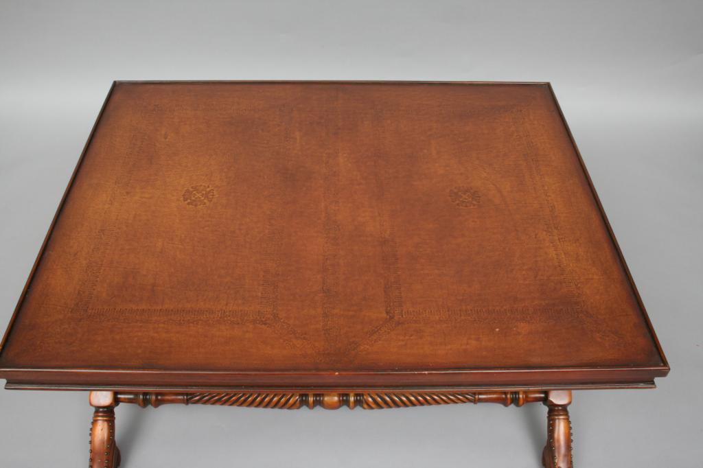 Modern, the rectangular top inset with leather, flanked on each side with pull-out extentions, raised on wrythen "X" frame supports terminating in boot form feet, connected by a wrythen stretcher shelf, accented with stud work. 20 1/4"H. 42"W. 32 1/2"D. Condition: excellent, no damage or repair.
