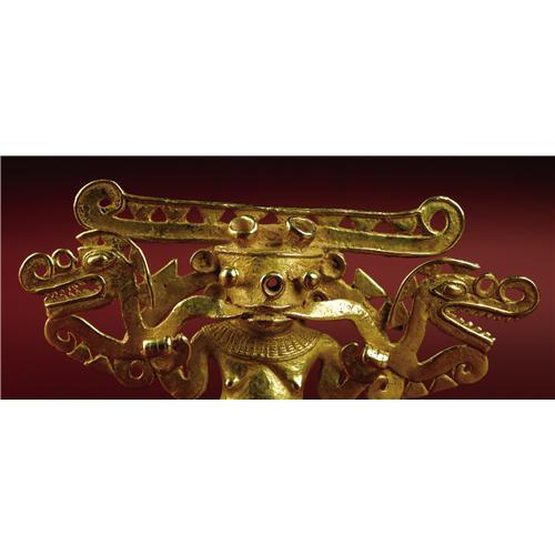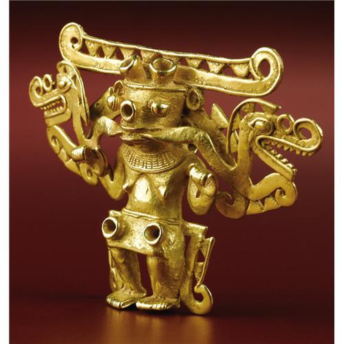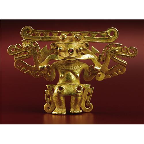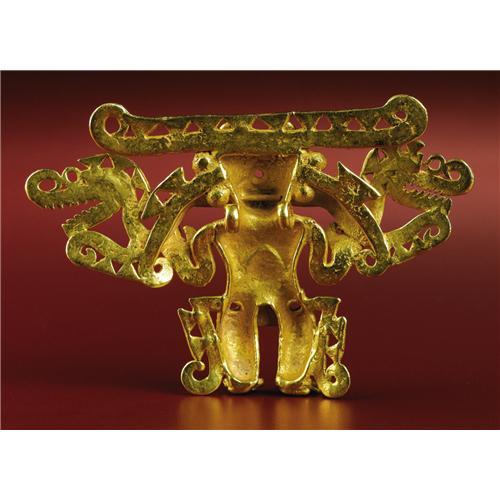 <B>Figure Biting Double-Headed Snake-Bodied Creature</B></I><BR>Coclé Province or Azuero Peninsula<BR>A.D. 650 - 1520<BR>Gold, Weight 133.2 grams<BR>Height 4 ¼ in. Width 2 ¾ in.<BR><BR>This figure was worn as a pendant suspended from the two loops at the back flanking the neck. With knees slightly bent, arms bent at the elbows, and hands clenched, the figure bites the ribbon-like body of a double-headed monster. The monster's heads are crested crocodiles with up-turned muzzles and serrated teeth in gaping jaws. Triangular shapes representing crocodile scutes outline the heads and front legs of the monsters. These triangular shapes and snout curls are repeated as an elongated headdress for the figure and also as projections from his waist along his legs to his feet, in all cases further enforcing the crocodilian presence. The figure wears a short kilt and a collar that suggests beading. There are nine concave cup-shaped forms on the body, including one representing the nose, that were probably inlaid with colored stones to further enhance the power of this piece. The condition is very good.<BR><BR>Provenance<BR>Charles Craig, Santa Barbara<BR><BR>