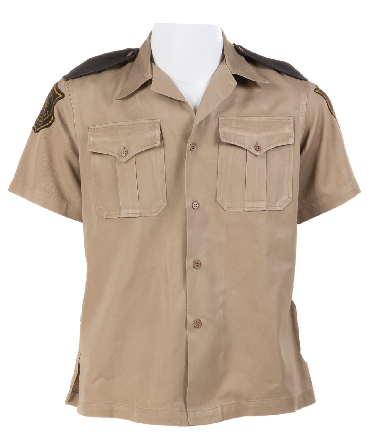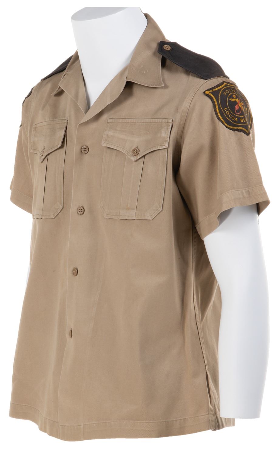 26. Cocoa Beach Police uniform shirt from I Dream of Jeannie.(NBC, 1965-70) Vintage original short sleeve khaki shirt with pointed collar, brown epaulets, 2-printed "Police Cocoa Beach, FLA" patches on shoulders, 2-chest flap pouch pockets, with button front closure. Exhibiting age and production wear with some deterioration to print on patches. In vintage very good condition. Accompanied by a COA from Golden Closet. $300 - $500