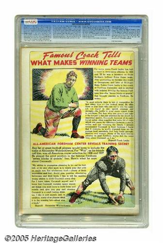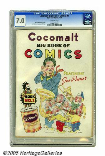 <B>Cocomalt Big Book of Comics #1 (Chesler, 1938) CGC FN/VF 7.0 Off-white pages.</B></I> This promotional comic received a scarcity rating of "8" in Gerber's <B>Photo-Journal</B></I>. The comic certainly offered an eclectic mix: radio comedian Joe Penner (whose big catchphrase was "Wanna buy a duck?") shares the cover with six (not seven) dwarves, and inside there's everything from Little Nemo by Winsor McCay to the science fiction hero Dan Hastings (drawn by Fred Guardineer). There's also Jack Cole art in these pages. The cover is by Charles Biro. A glance at the back cover tells you how old this comic is -- it shows Frank Leahy <I>before</B></I> he became coach at Notre Dame and Hall of Famer Alex Wojciechowicz before he even started playing pro football! The highest grade CGC has assigned for this issue is a 7.5. Overstreet 2005 FN 6.0 value = $645; VF 8.0 value = $1,344. CGC census 4/05: 1 in 7.0, 1 higher.